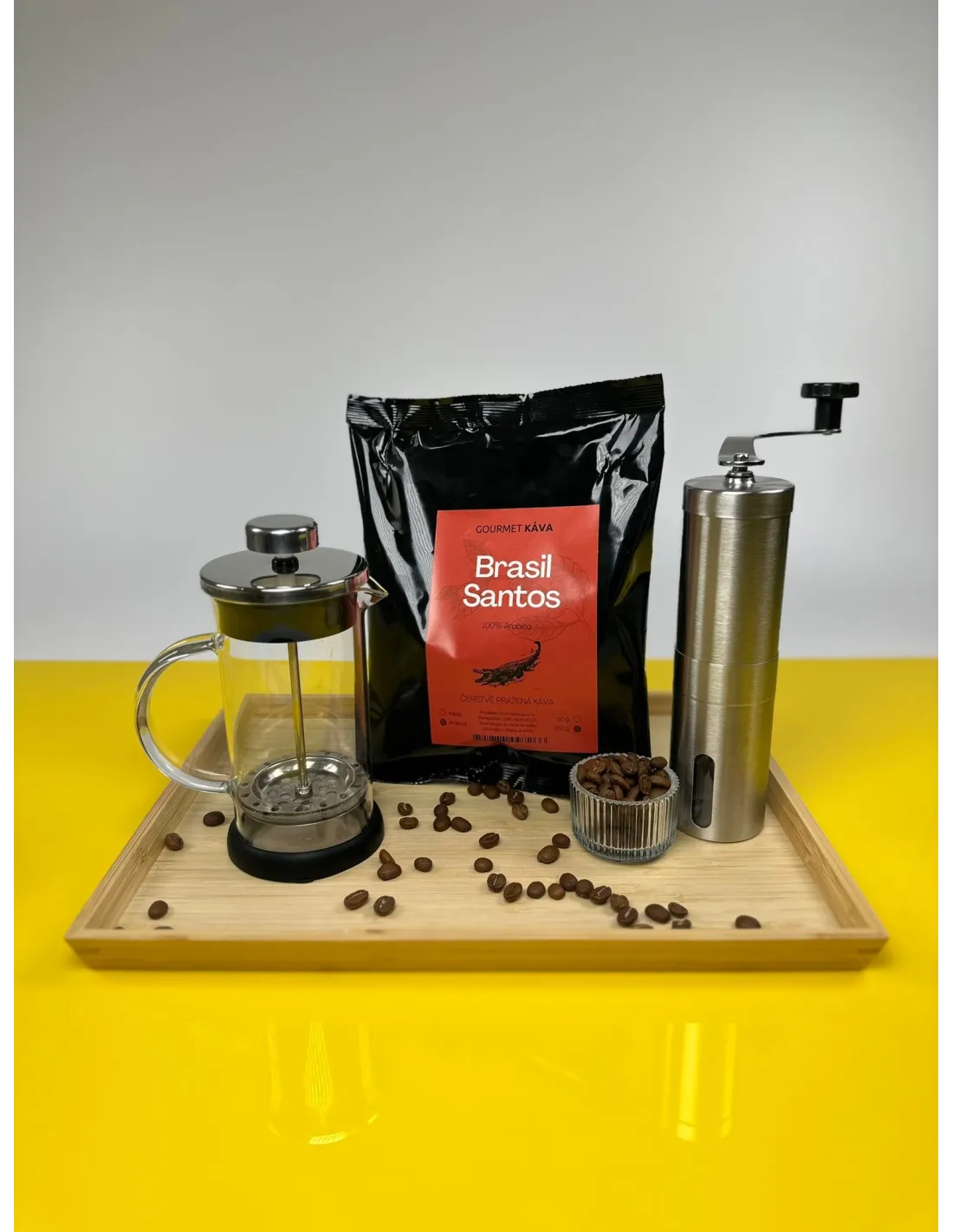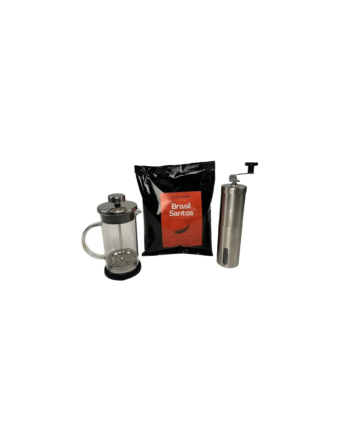 Paket sadrži ručni mlinac za kavu Kaffia Tall, pakiranje od 250g 100% arabica kave Brasil Santos i, konačno, nehrđajući French press od 350ml za jednostavnu pripremu svježe kave!