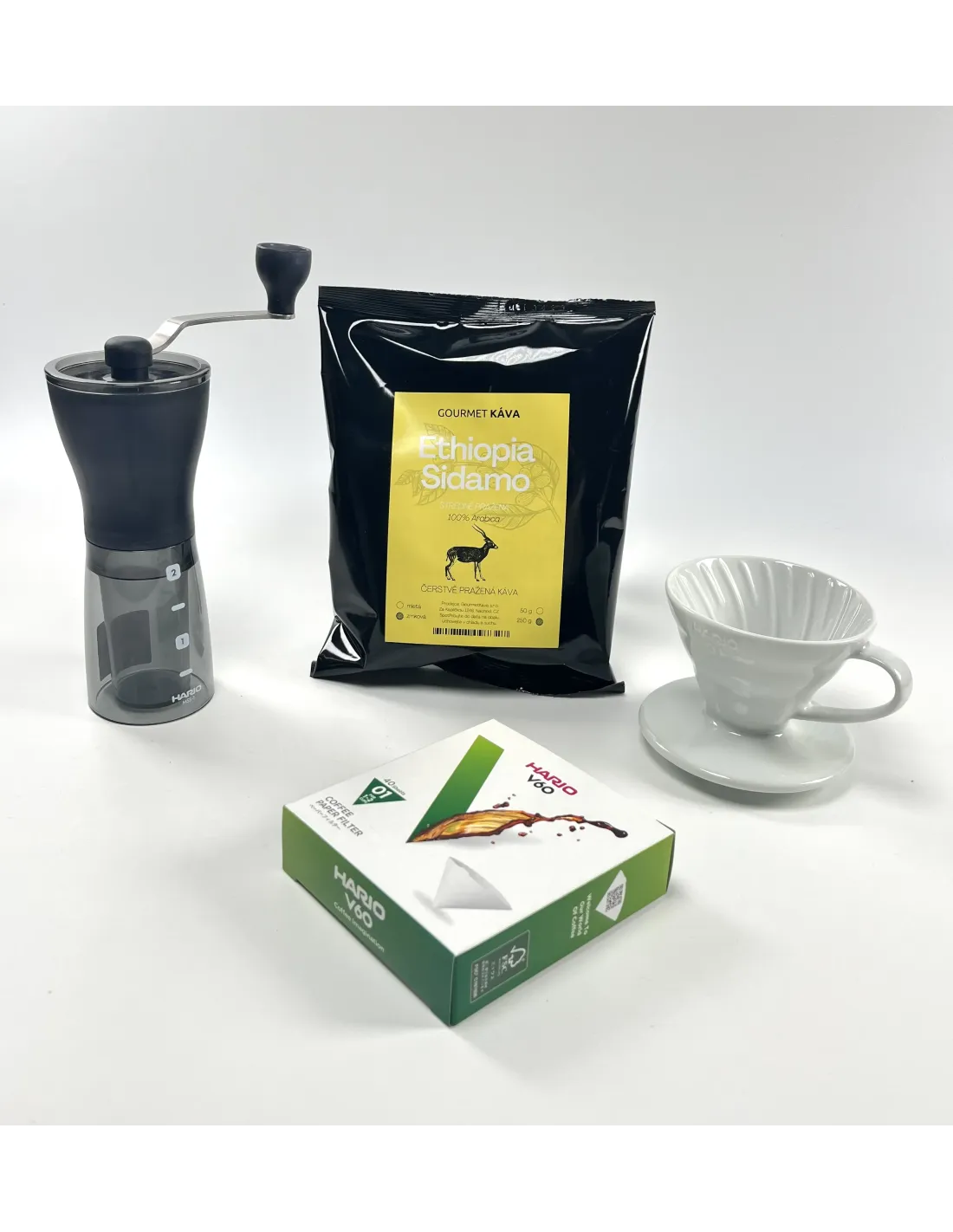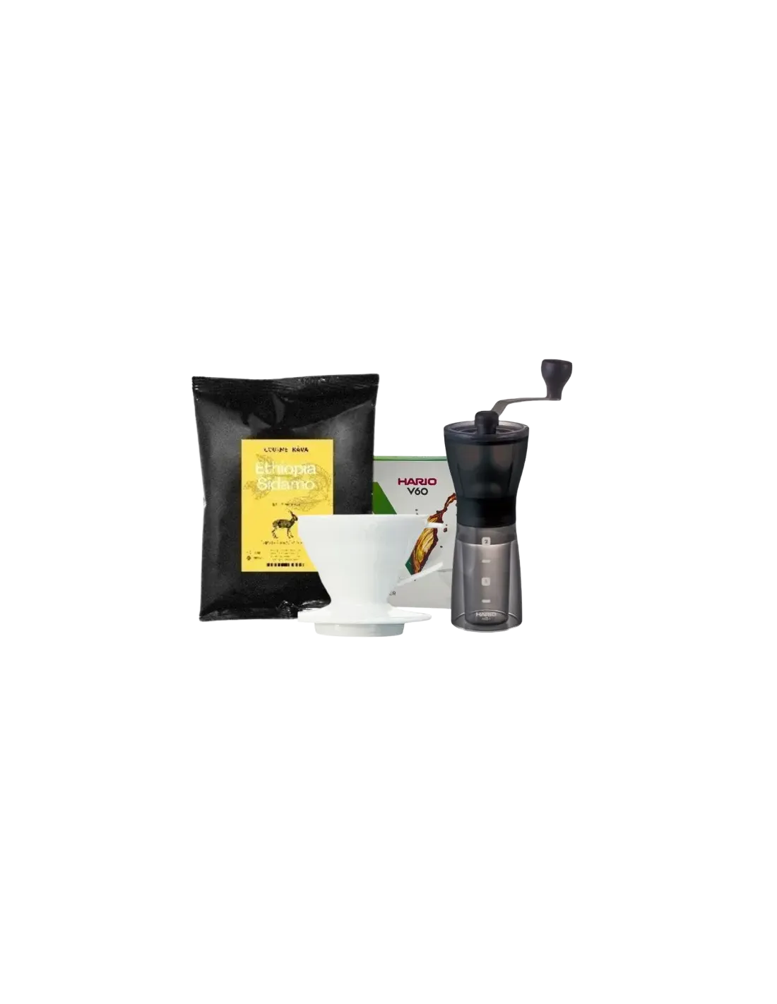 Svježa kava Etiopija Sidamo – srednje pržena, 250g, mlinac Hario Mini Mill Slim Plus i keramički dripper Hario V60-01 s filtrima kao kompletan profesionalni set za pripremu savršene filtrirane kave.