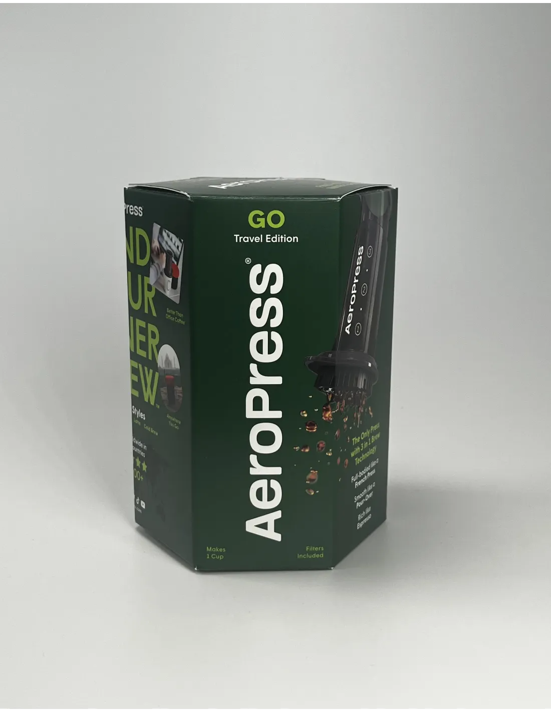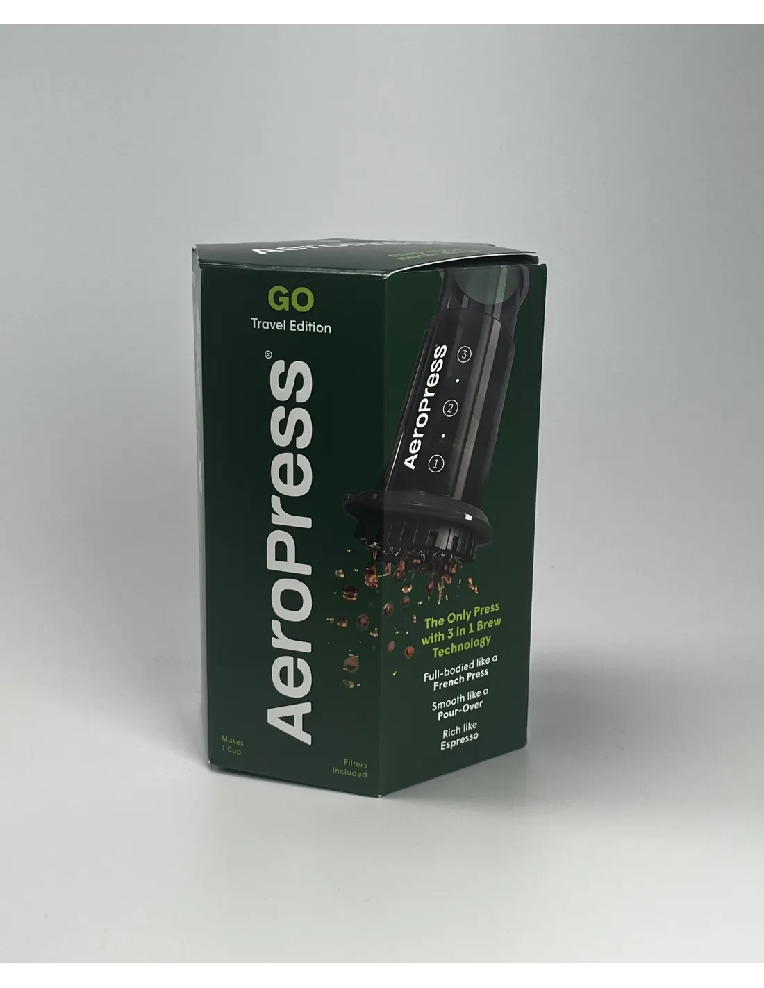 Aeropress GO nova je verzija klasičnog Aeropressa, nešto manji od originalnog Aeropressa i uključuje i šalicu (i nekoliko drugih dodataka, vidi dolje), u koju se Aeropress može spakirati i iz koje se može piti pripremljena kava. Paket također sadrži 50 filtera, koji su isti kao kod prethodne verzije. Aeropress je izvrstan uređaj koji kombinira prednosti French pressa, filtrirane kave i tradicionalnog aparata za kavu. Mnogi ljubitelji kave zavoljeli su Aeropress jer omogućuje istraživanje neograničenih okusa kave eksperimentiranjem s vremenom pripreme, temperaturom vode i finoćom/grubošću mljevenja.