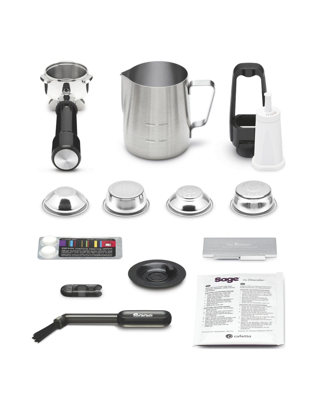Paket uključuje profesionalne filtere , vrč od nehrđajućeg čelika , Razor™ alat za ravnanje kave i četkicu za čišćenje .