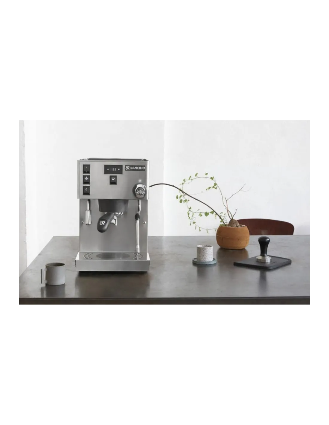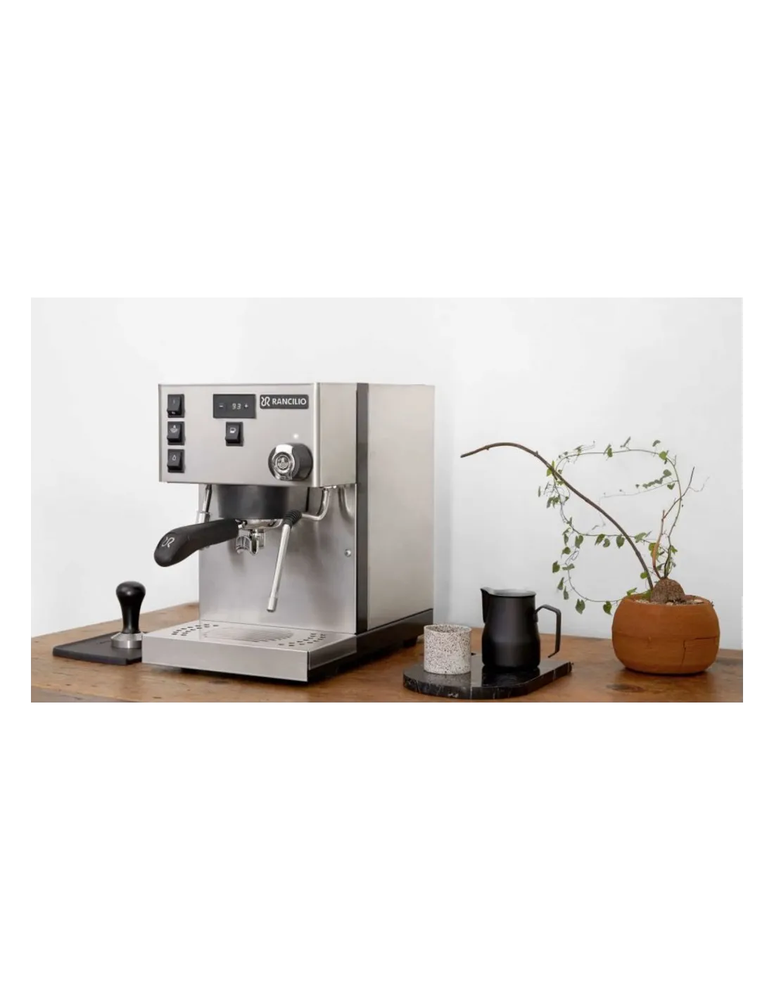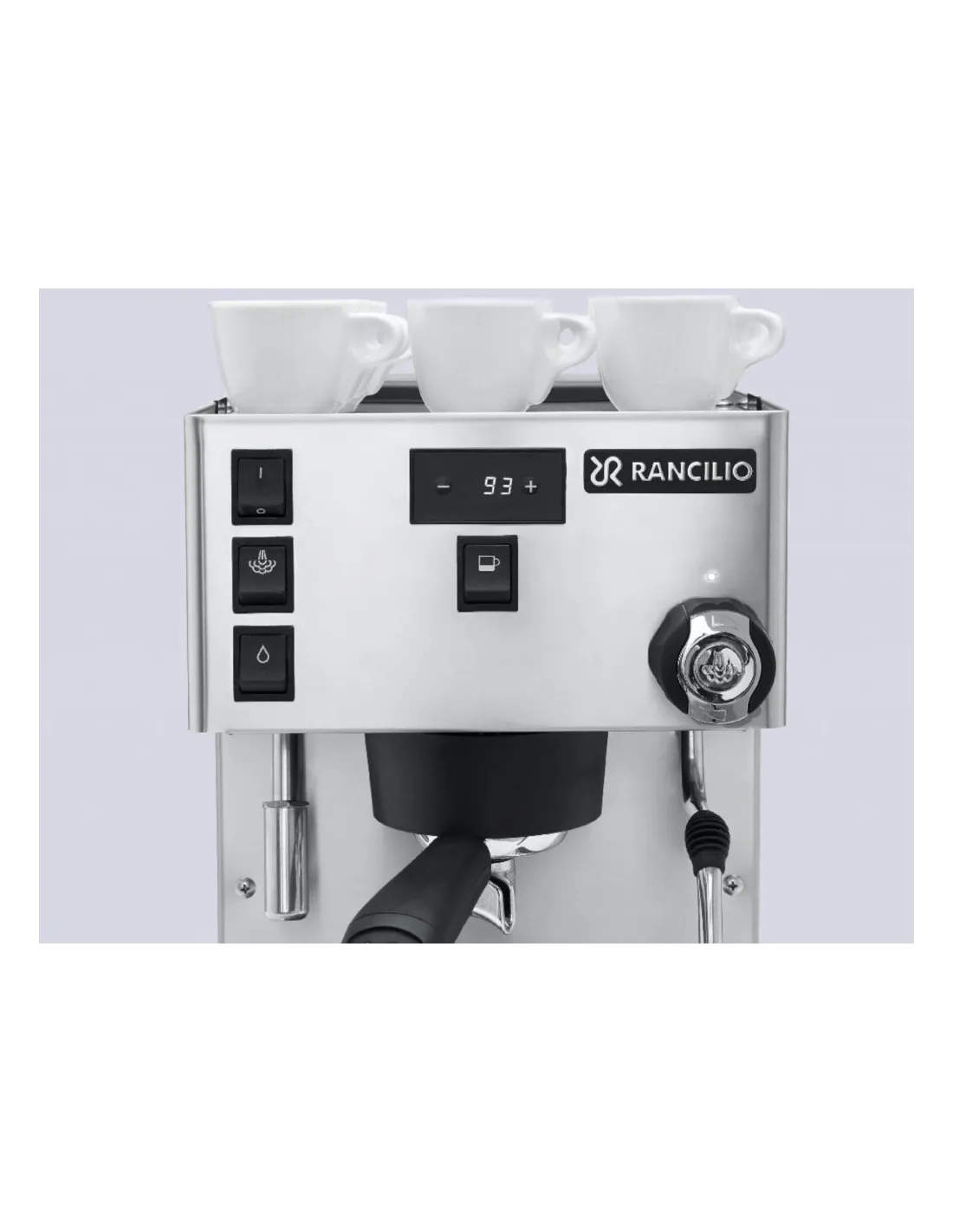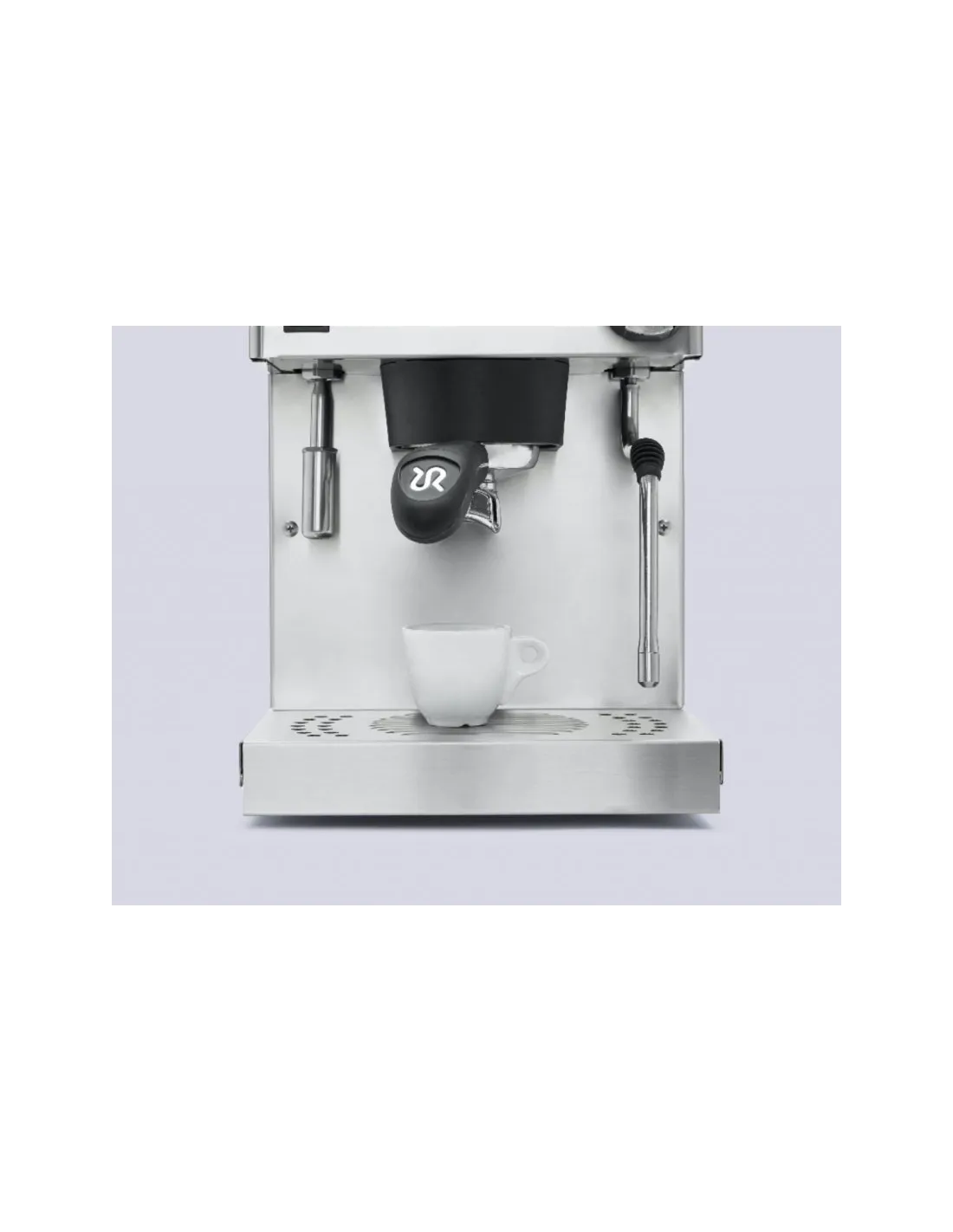 Poluprofesionalni aparat za kavu Rancilio Silvia Pro s dvostrukim kotlom , PID kontrolom temperature i digitalnim zaslonom za kontrolu temperature i vremena ekstrakcije. Opremljen je ručnim doziranjem .