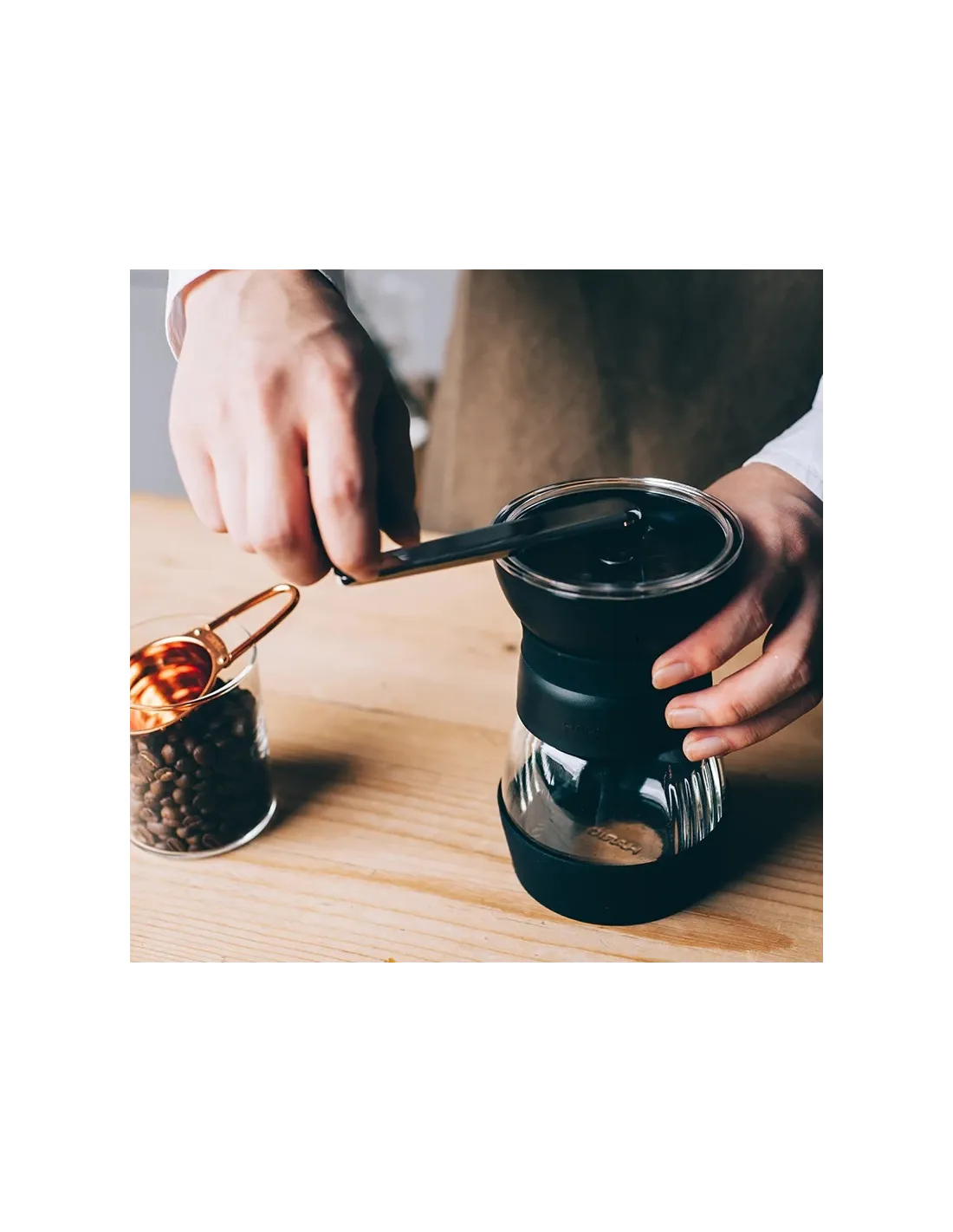 Mlýnek se díky ergonomickému tvaru velice snadno drží v ruce a mletí je tak velice pohodlné. Spodní část mlýnku je vybavena protiskluzovou podložkou z odolné pryže, která zajistí, že Vám mlýnek při mletí nebude skákat ani na kluzkém povrchu. Průhledná skleněná nádobka na mletou kávu je vybavena víčkem, takže ji můžete využít pro uskladnění kávy pro pozdější použití. Vejde se do ní až 100g kávy. U Skertonu PRO jistě potěší i silikonová obruč v místě uchopení mlýnku, která dělá mletí pohodlnější.
