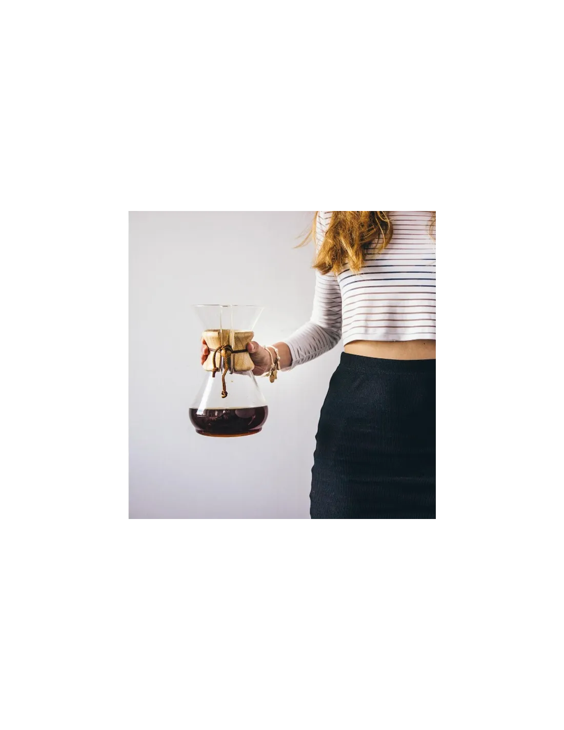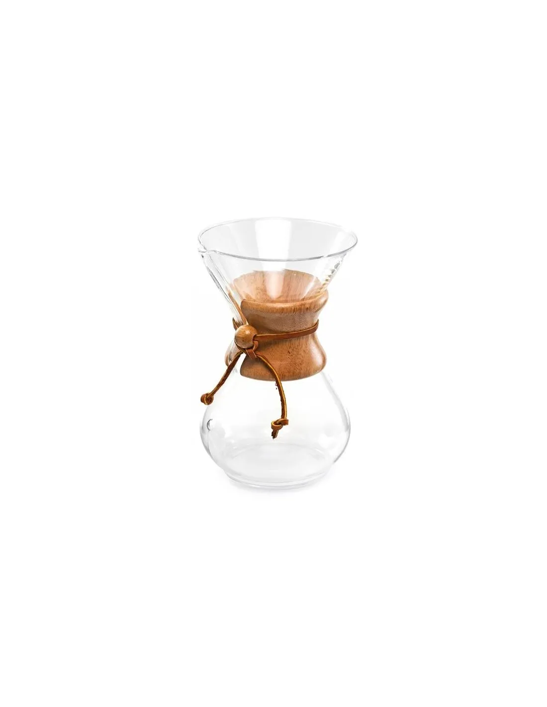 Chemex , koji na prvi pogled podsjeća na bokal za vodu, izrađen je od borosilikatnog stakla i ima drveni steznik vezan na sredini kožnim remenom.