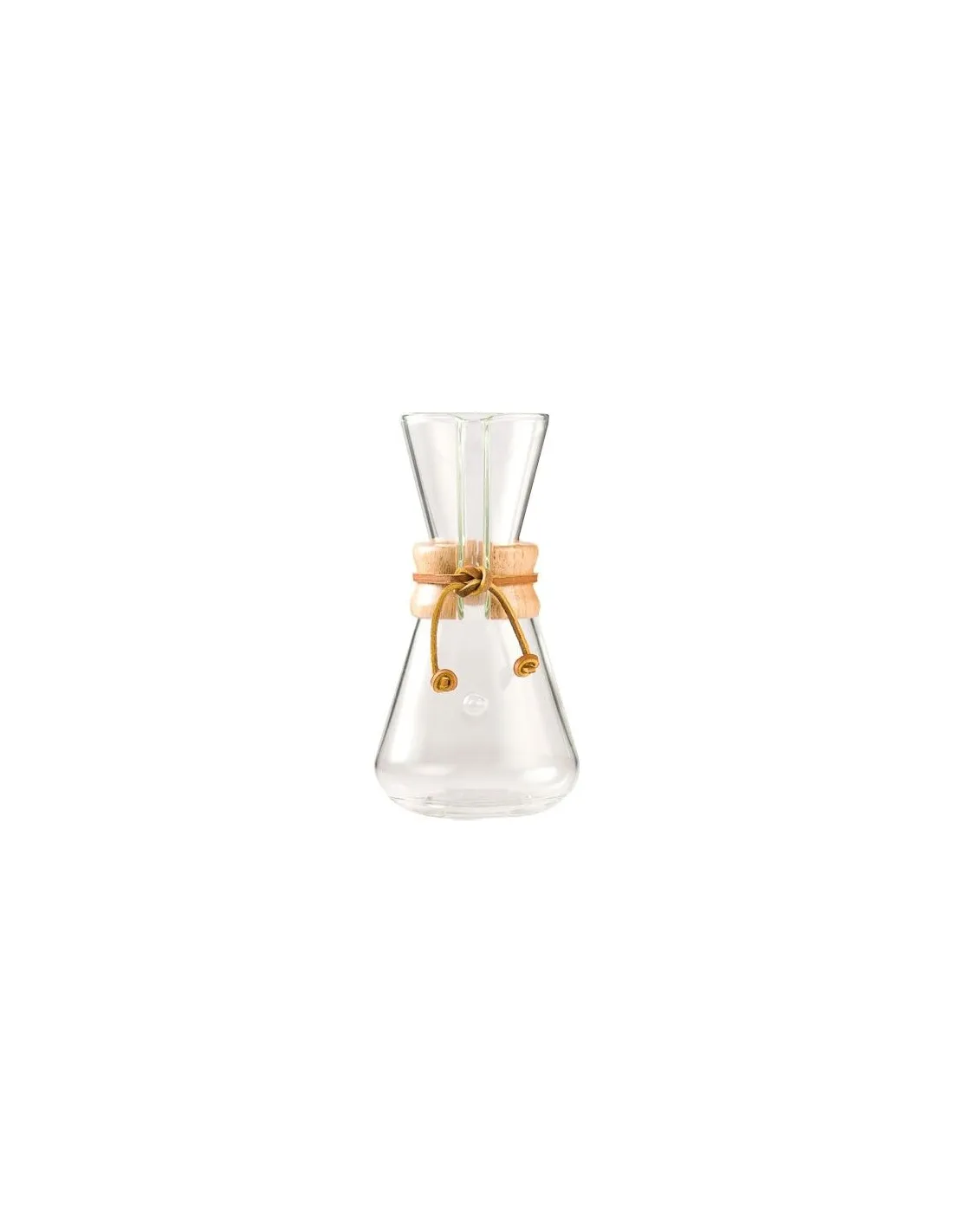 Chemex , koji na prvi pogled podsjeća na bokal za vodu, izrađen je od borosilikatnog stakla i ima drveni korzet vezan na sredini kožnim remenom.