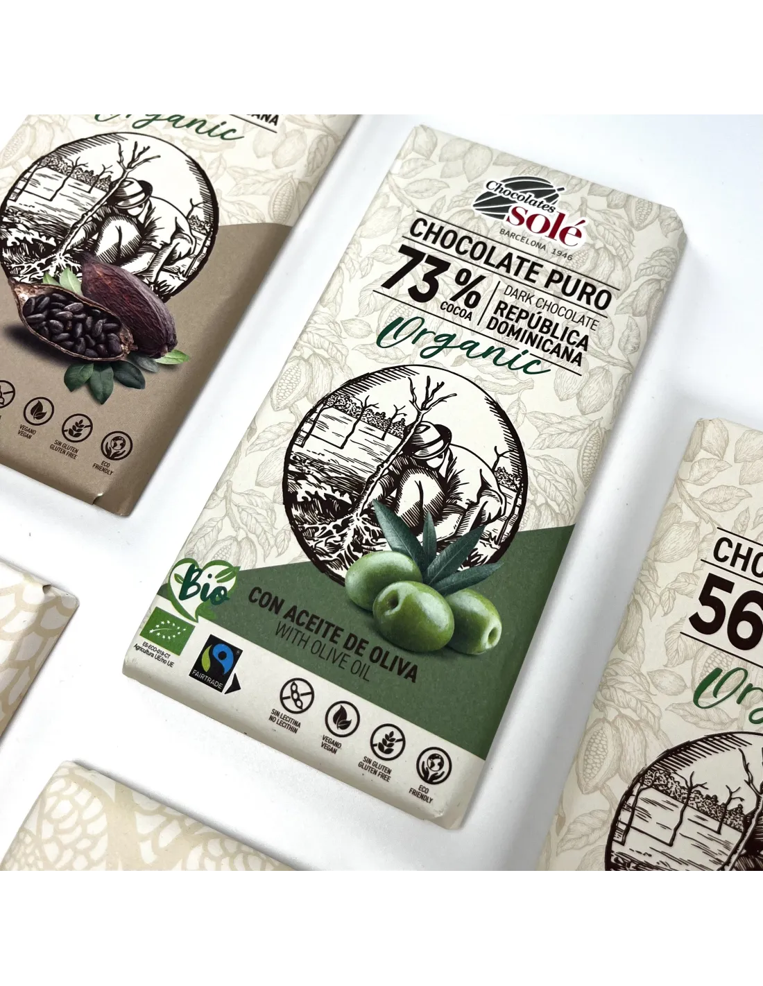 Chocolates Solé- 73% organska čokolada s maslinovim uljem. Svježi mediteranski povjetarac. Ovo je čokolada s ekstra djevičanskim maslinovim uljem .