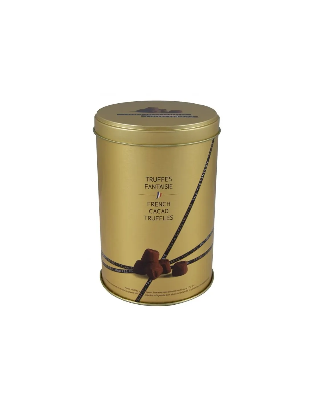 Fini francuski kakao tartufi s brendijem Marc de Champagne 3%, upakirani u zlatni limeni cilindar elegantnog mat dizajna.