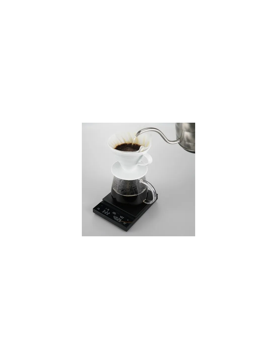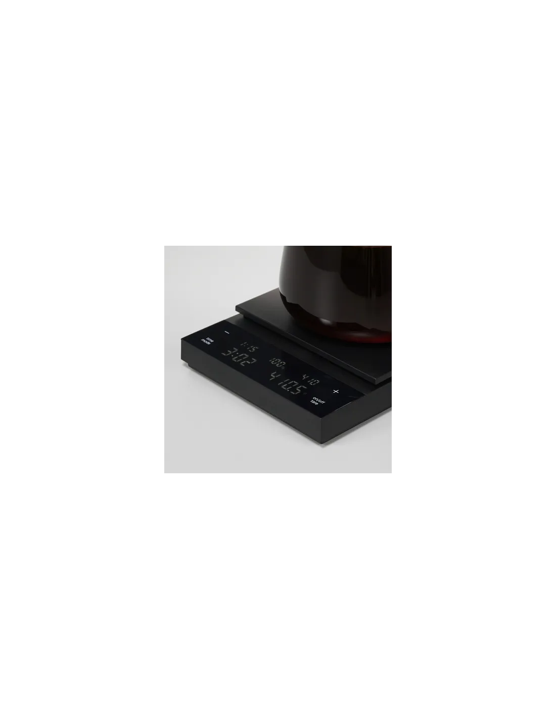 Vaga impresionira svojim minimalističkim i elegantnim dizajnom s visokokvalitetnim materijalima i preciznom obradom svakog detalja. Kućište je izrađeno od glatke, matirane plastike, što doprinosi cjelokupnom dojmu čistoće i modernog izgleda. Zahvaljujući svojim kompaktnim dimenzijama, vaga lako prima dodatke kao što su Chemex, kapaljka ili AeroPress.