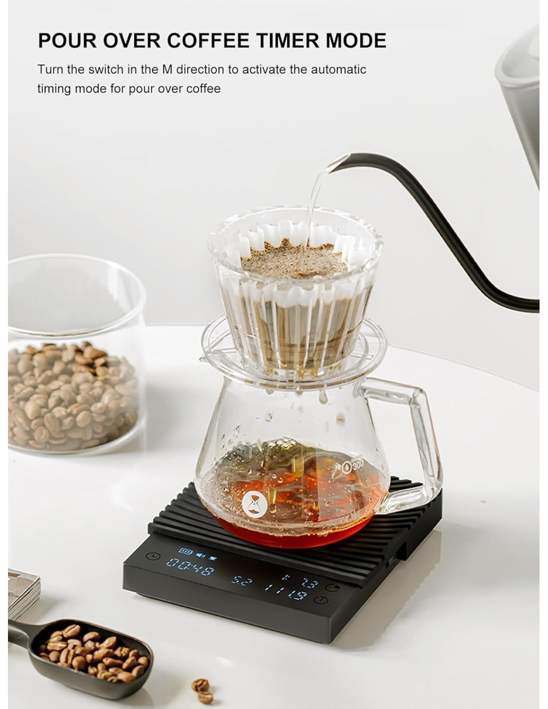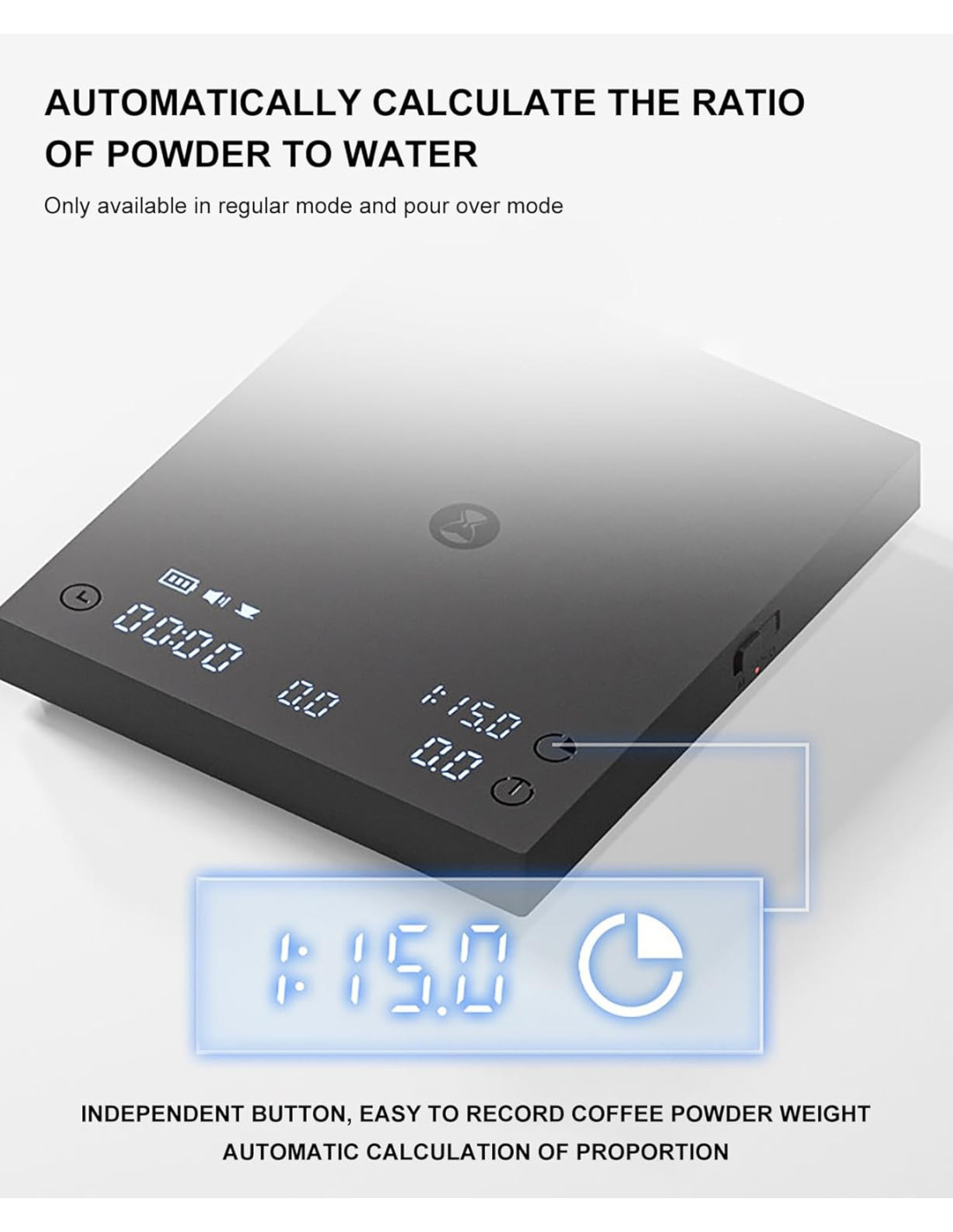 Nudi 3 načina rada - Regular, Pour-Over i Espresso , točnost od 0,1 g , raspon vaganja od 0,5 do 2000 g , integrirani timer i izračun omjera kave i vode.