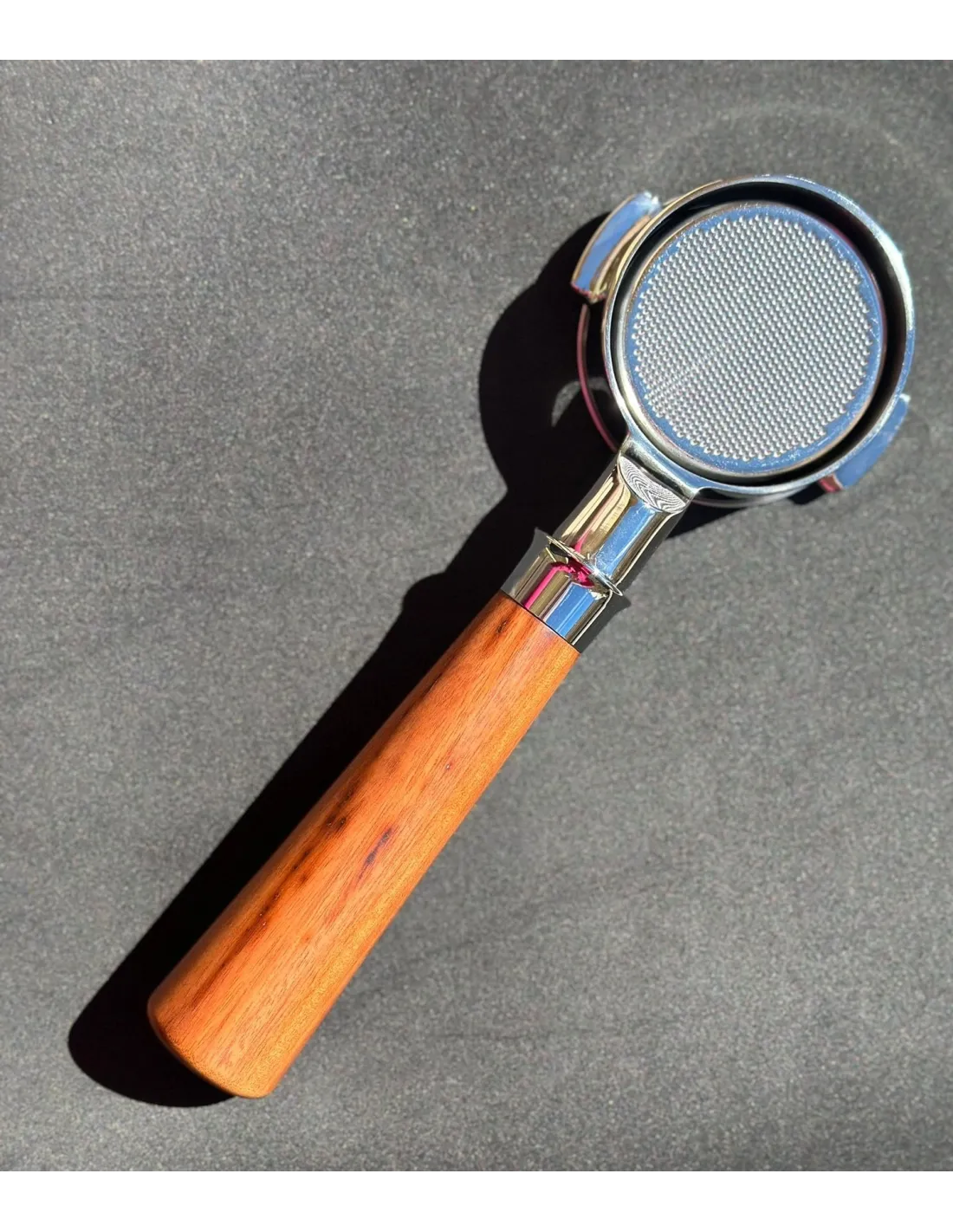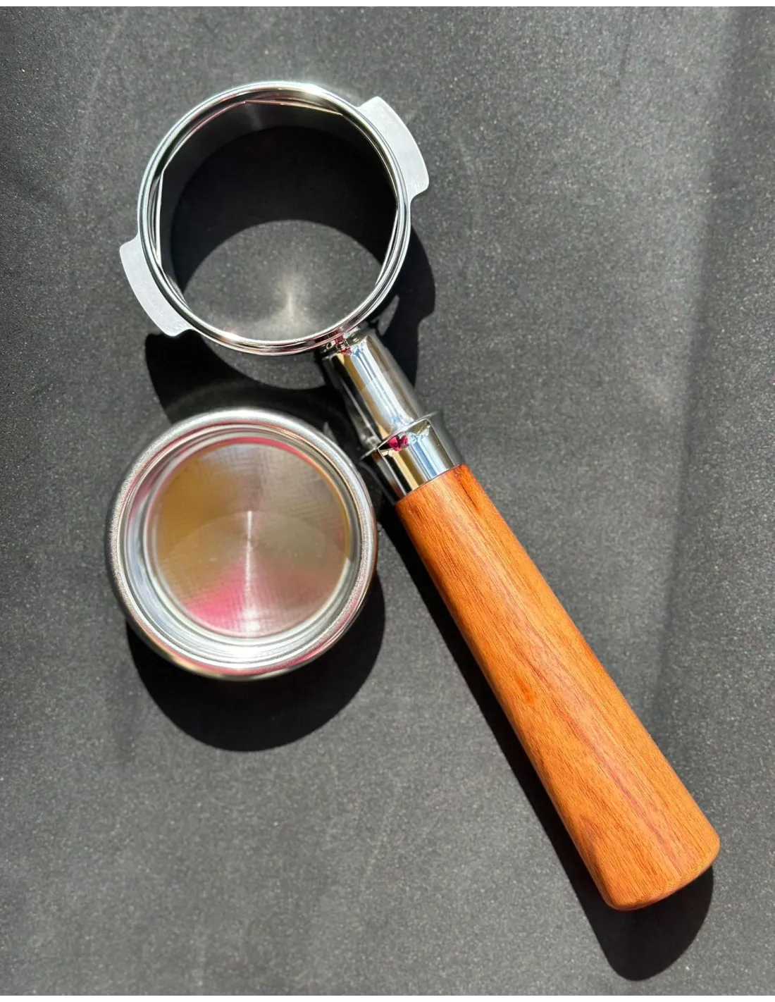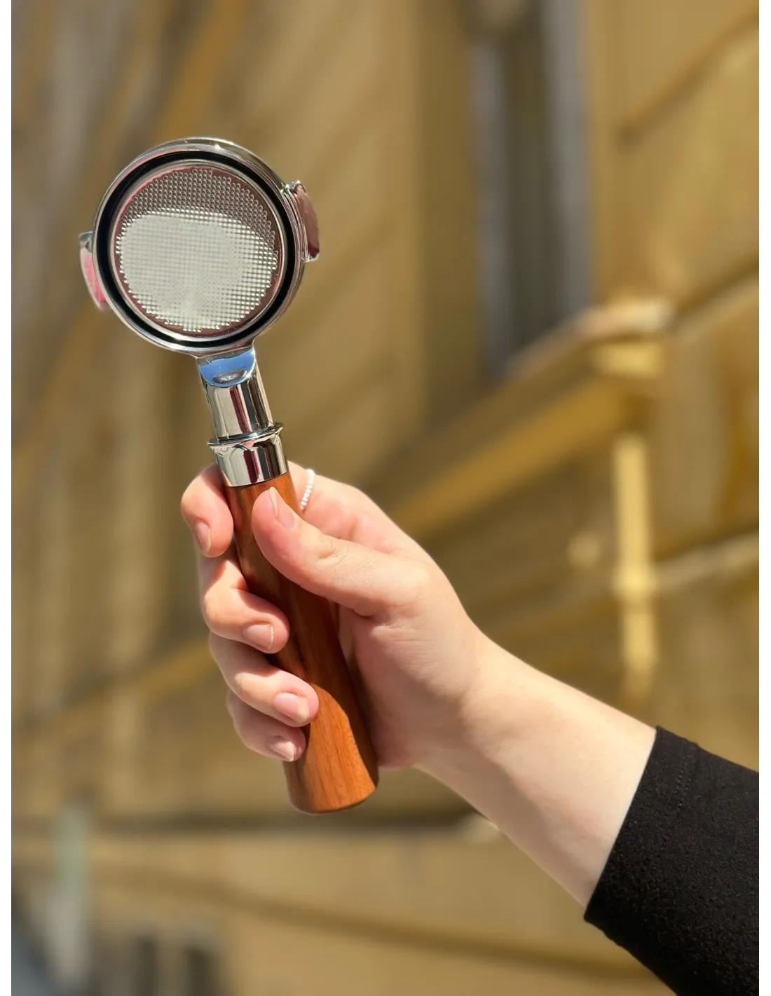 Kaffia Bottomless Portafilter 58 mm gola poluga izrađena je od kromiranog mesinga i ima udobnu drvenu ručku.