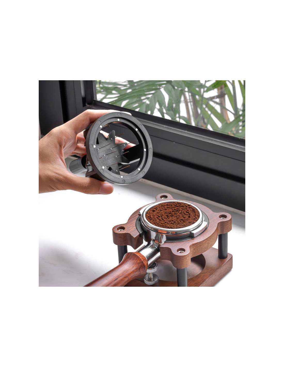 Kaffia WDT Premium V2 je vrhunski distributer kave s iglama koji pripremu espressa podiže na profesionalnu razinu. Opremljen je finim iglama od nehrđajućeg čelika koje razbijaju grudice mljevene kave i osiguravaju njezinu ravnomjernu raspodjelu u ručici . To eliminira stvaranje kanala tijekom ekstrakcije , a dobiveni napitak je puniji, uravnoteženiji i stabilnijeg okusa.