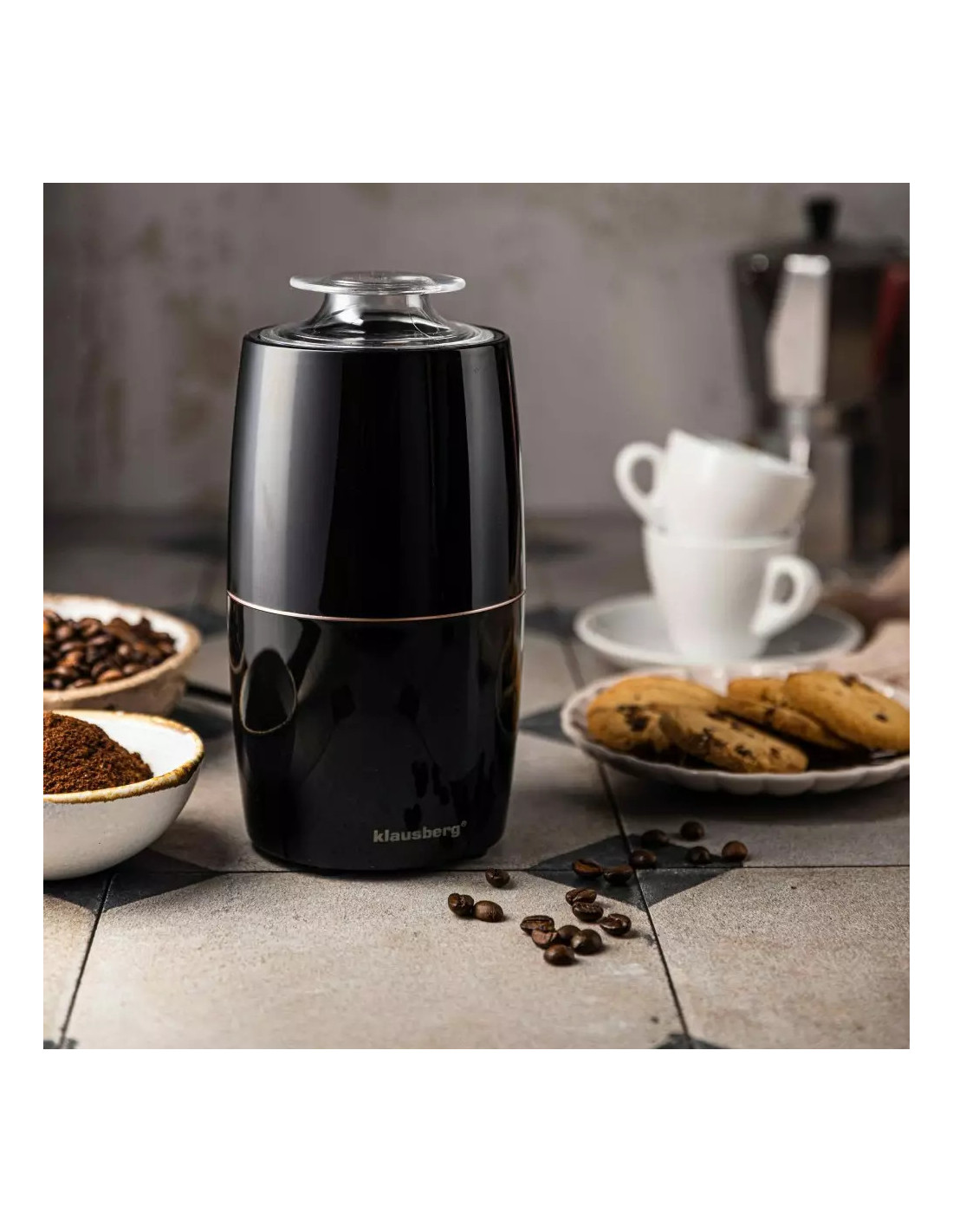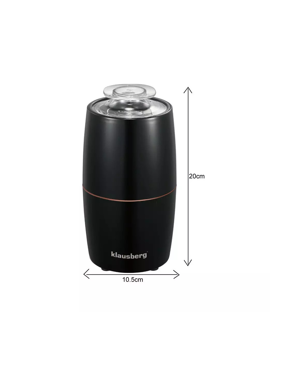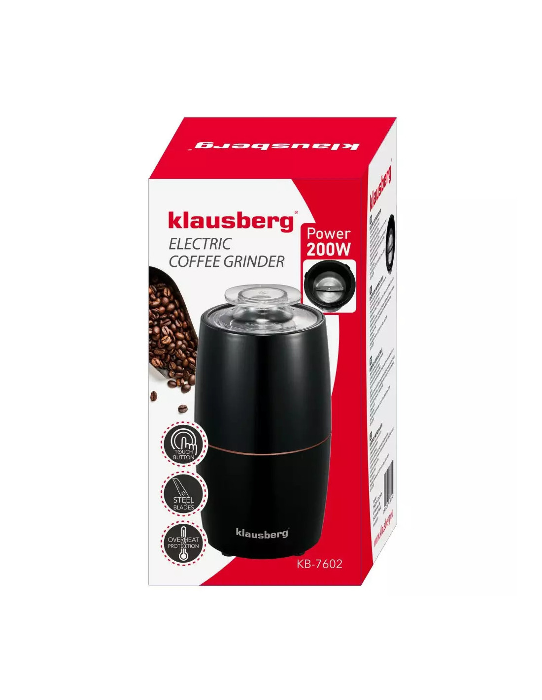 Kompaktni električni mlinac Klausberg s oštricom i spremnikom od nehrđajućeg čelika . Jednostavno upravljanje jednim gumbom, pogodan za fino i grubo mljevenje.