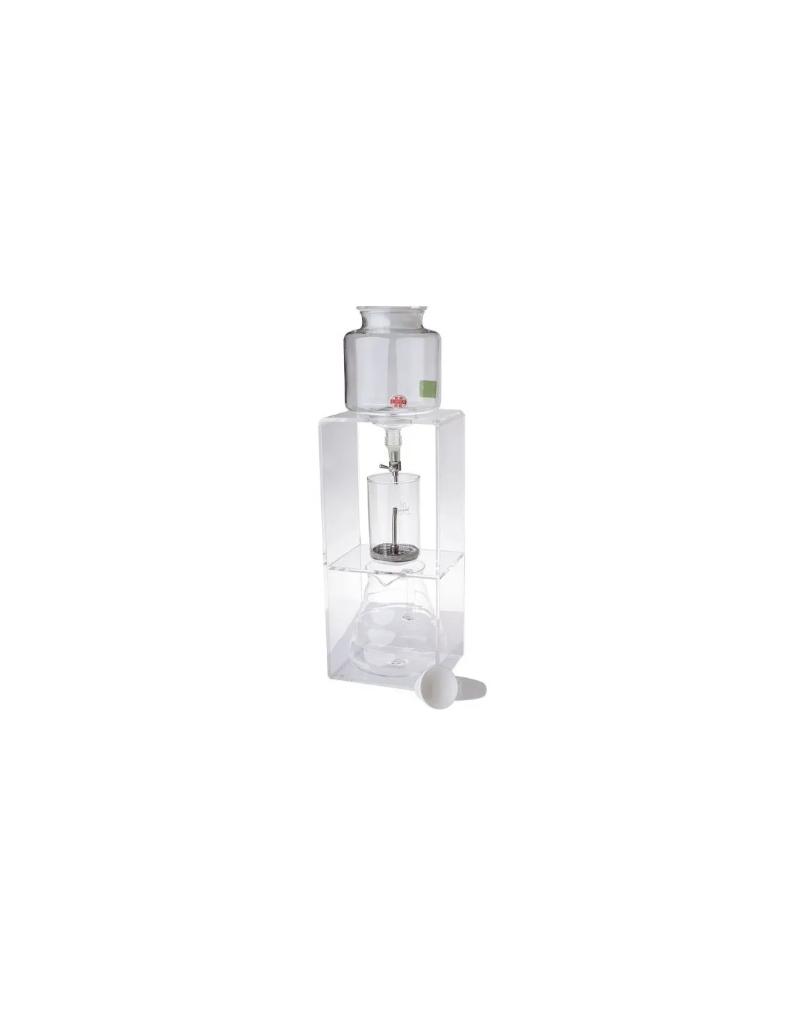 U gornjoj posudi nalazi se hladna voda koja kroz filter od nehrđajućeg čelika polako kaplje kroz kavu u donju posudu za posluživanje. Zahvaljujući metalnom ventilu , možete jednostavno prilagoditi protok vode . Filtriranje traje nekoliko sati, ovisno o postavci ventila i vašem ukusu. Idealno je postaviti brzinu protoka na 1 kap u sekundi. Zatim se puna posuda filtrira za približno 5 sati. Također možete eksperimentirati s grubošću kave koju odaberete.