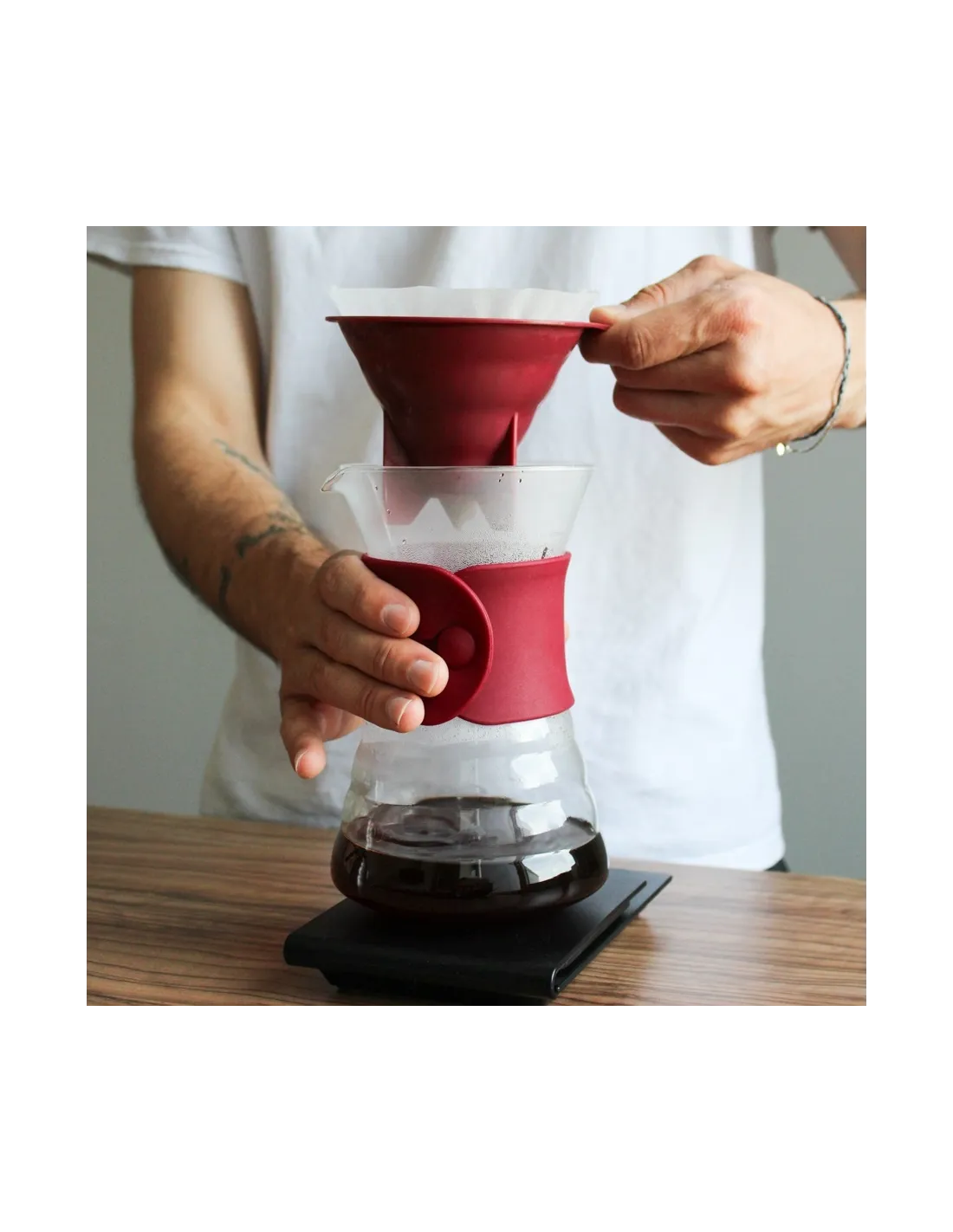 Cijeli set će vas osvojiti svojom neizmjernom elegancijom i praktičnošću. Jednostavno stavite kapaljku u dekanter, ubacite filter, srednje grubo mljevenu kavu, ulijete i uživate u pogledu na svježu kavu koja se filtrira.