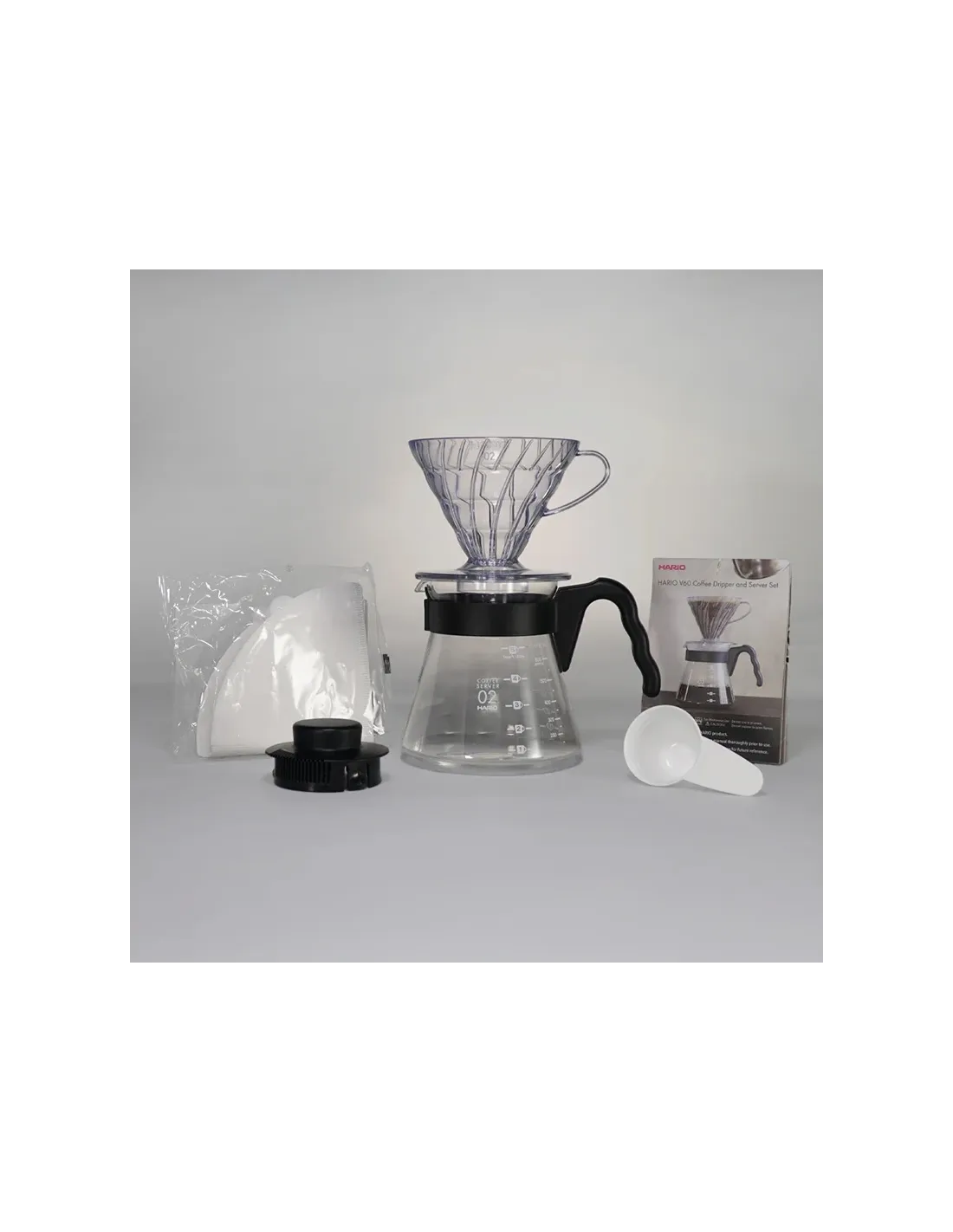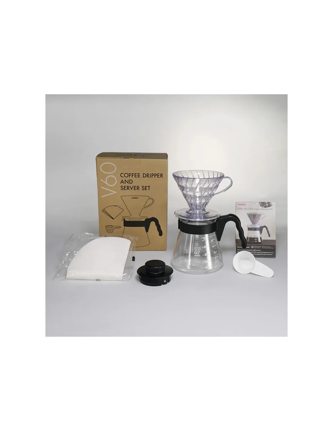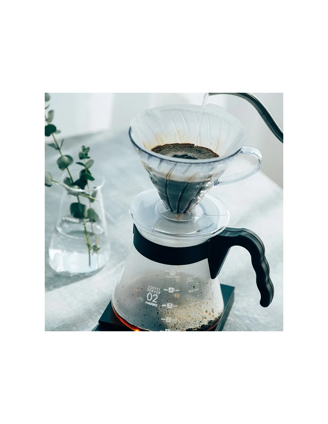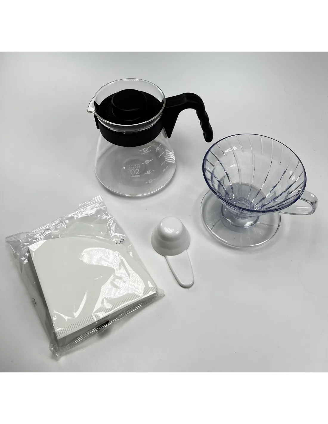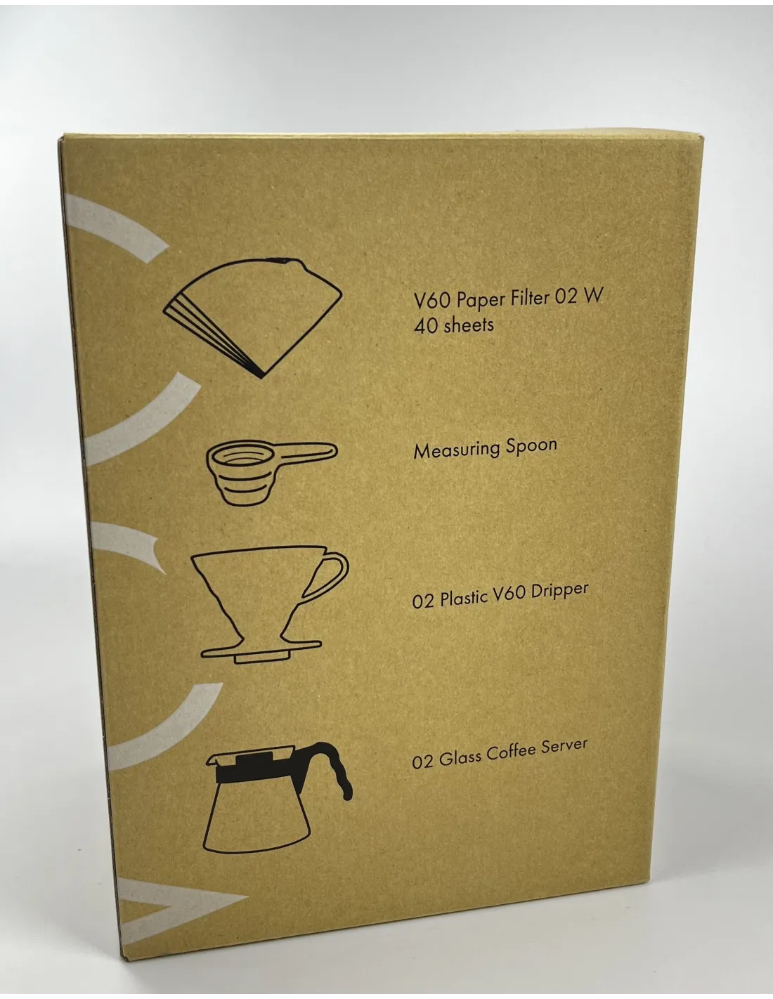 Set uključuje plastični dripper Hario V60-02 za pripremu 1-4 šalice, staklenu posudu Hario s plastičnom drškom i poklopcem zapremine 600 ml, 40 komada bijelih papirnatih filtera i plastičnu mjericu za kavu. Jednostavno sve na jednom mjestu u vrhunskoj Hario kvaliteti.