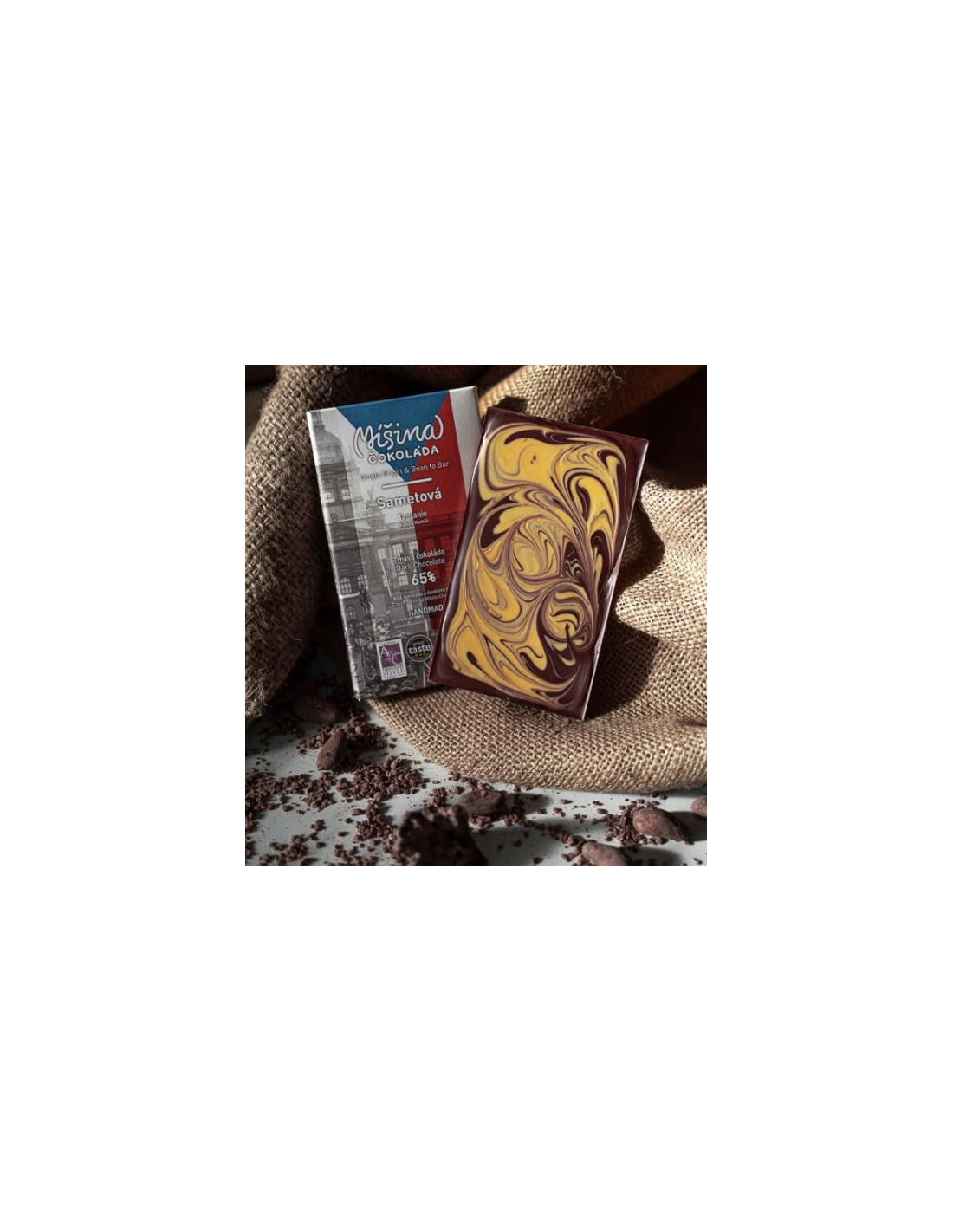 Tamna čokolada, 65% napravljena od organskih zrna kakaa iz Tanzanije, ručno je ukrašena bijelom čokoladom s češkim šipkom.