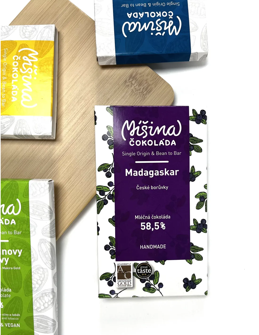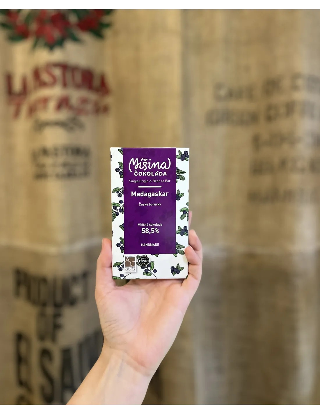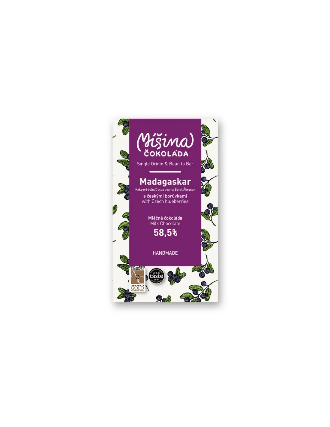 Mliječna čokolada napravljena od organskih zrna kakaovca s Madagaskara . Ove mahune imaju okus voća , a dodane su i borovnice iz čeških šuma .