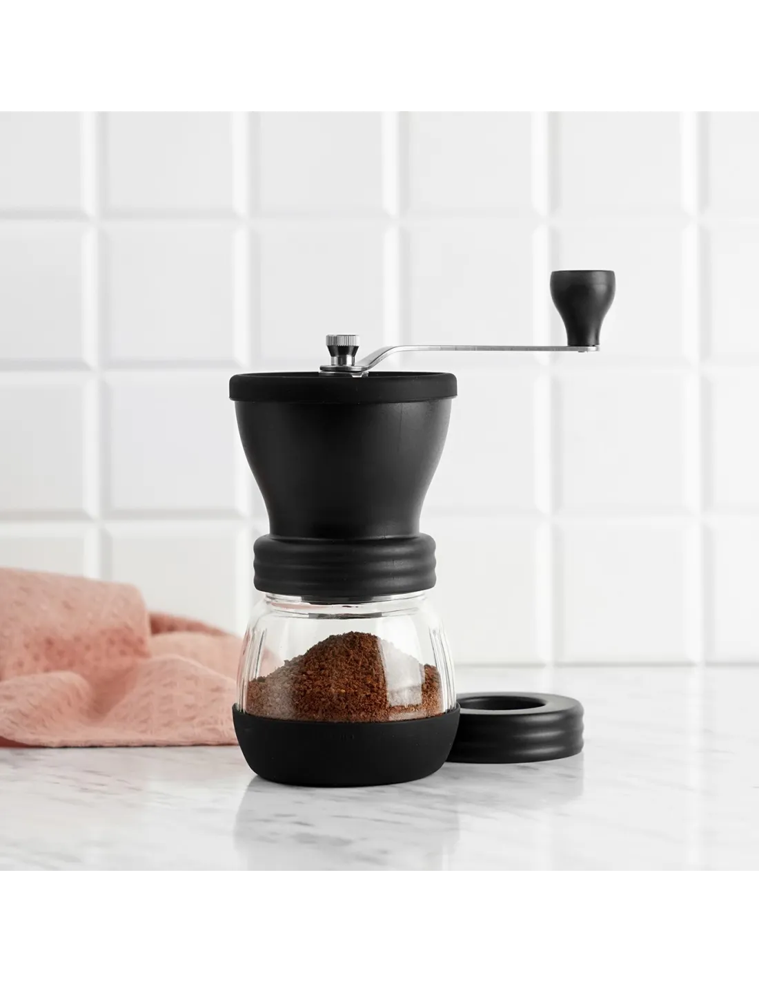 Zahvaljujući svom ergonomskom obliku , mlin se vrlo lako drži u ruci, što mljevenje čini vrlo udobnim. Donji dio mlina opremljen je protukliznom podlogom od izdržljive gume, koja osigurava da mlin neće skakati čak ni na skliskoj površini. Prozirna staklena posuda za mljevenu kavu opremljena je poklopcem , tako da je možete koristiti za spremanje kave za kasniju upotrebu. Može stati do 100 g kave .