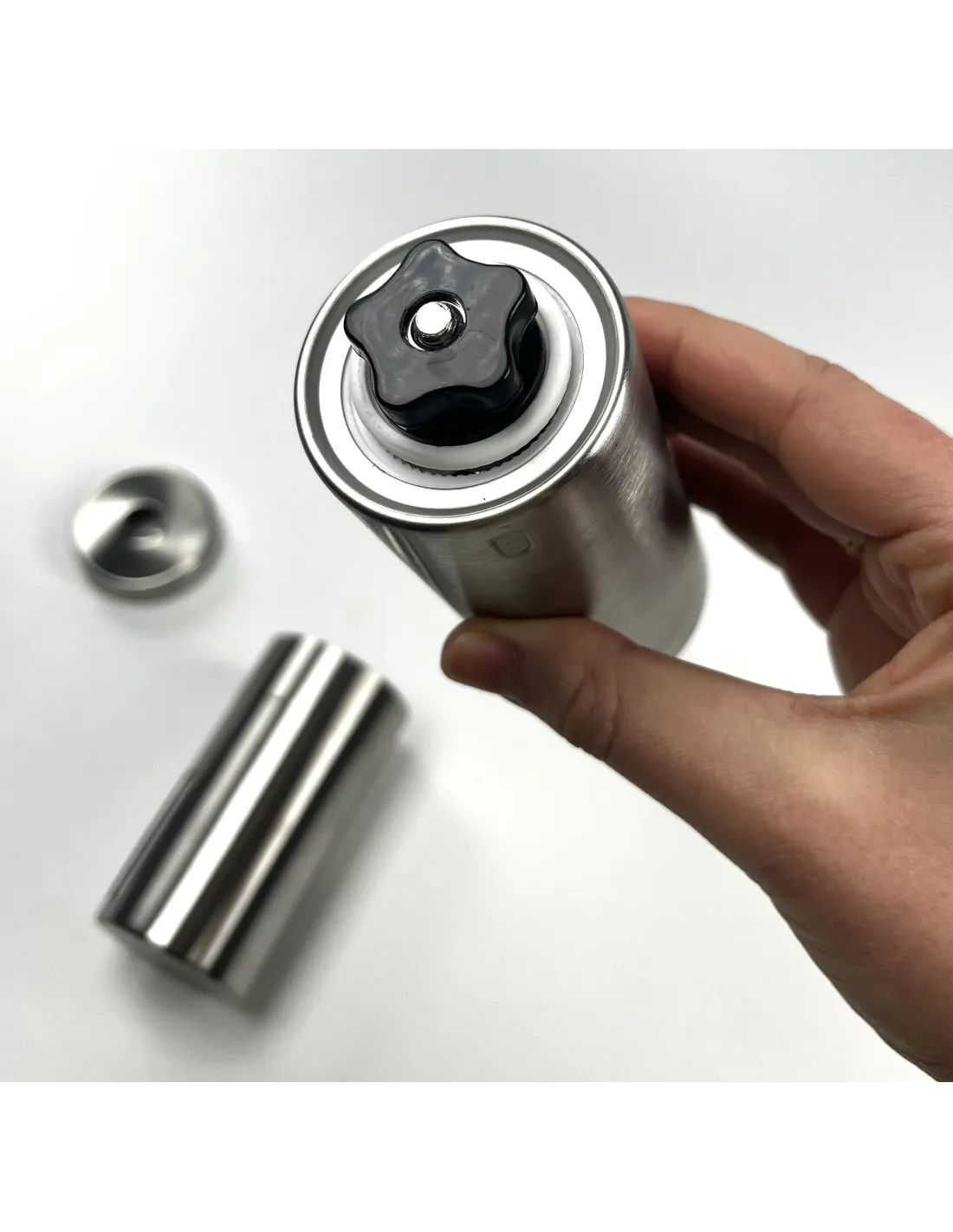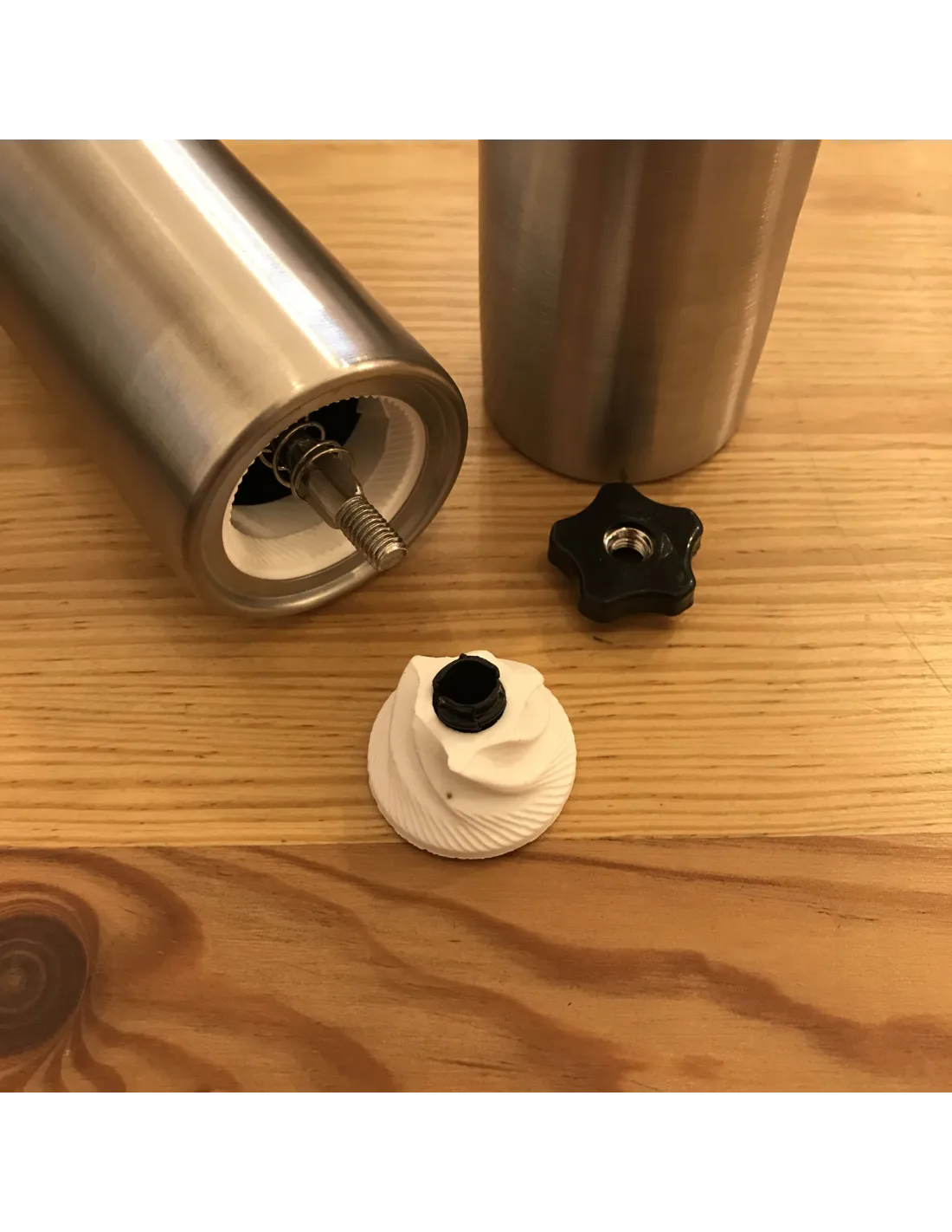 Kamenovi za mljevenje izrađeni su od keramike koja je vrlo nježna prema kavi. Na mlinu možete jednostavno podesiti gruboću mljevenja od finog do grubog . Mlinac savršeno pristaje u AeroPress .