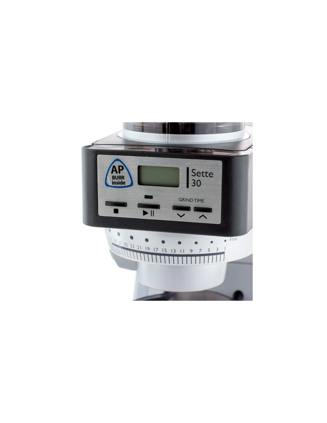Na prednjoj strani mlina pronaći ćete jednostavnu upravljačku ploču s LED pozadinskim osvjetljenjem . Korisnik mlina može podesiti vrijeme mljevenja s točnošću od 0,01 sekunde . Nakon pritiska na gumb uvijek ćete dobiti točnu dozu. (Za usporedbu, mlinci Sette 270 i Sette 270W imaju 3 podesive tipke na kojima se mogu programirati 3 različite vrijednosti, dok mlinac Sette 270 radi na principu podešavanja vremena mljevenja, a mlinac Sette 270W omogućuje podešavanje težine mljevena kava).