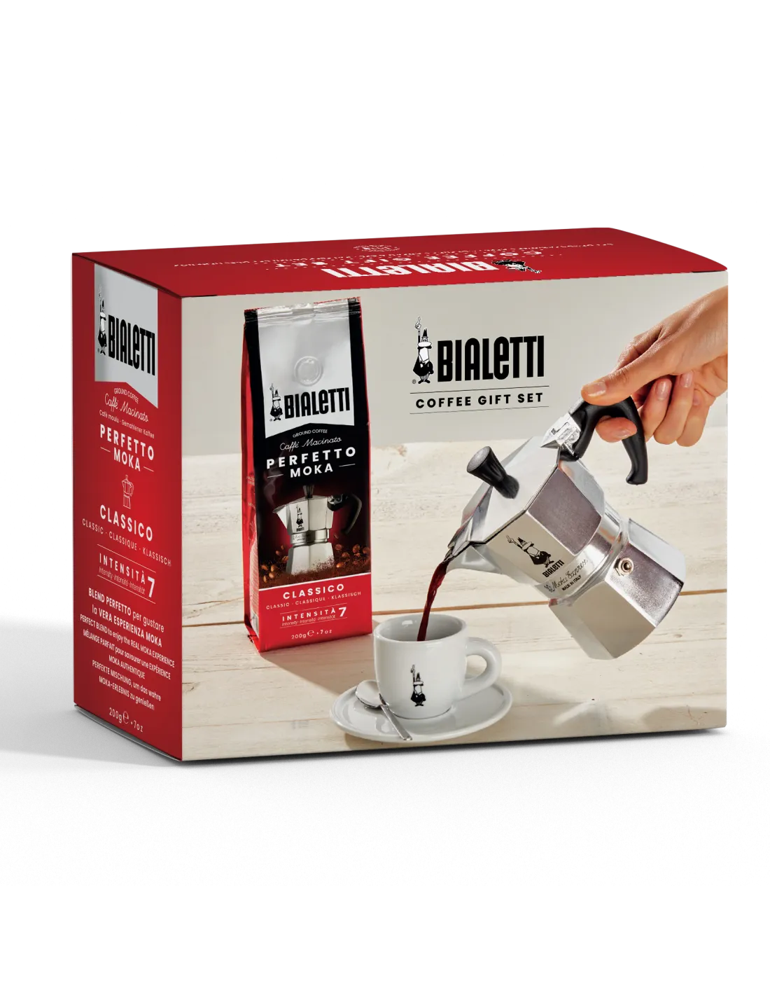 Legendarni moka lonac Bialetti Moka Express talijanske tvrtke Bialetti za tradicionalnu pripremu jače kave. Prikladno za 6 šalica, tj. cca 270 ml . Poklon kutija s kavom Bialetii 200g.