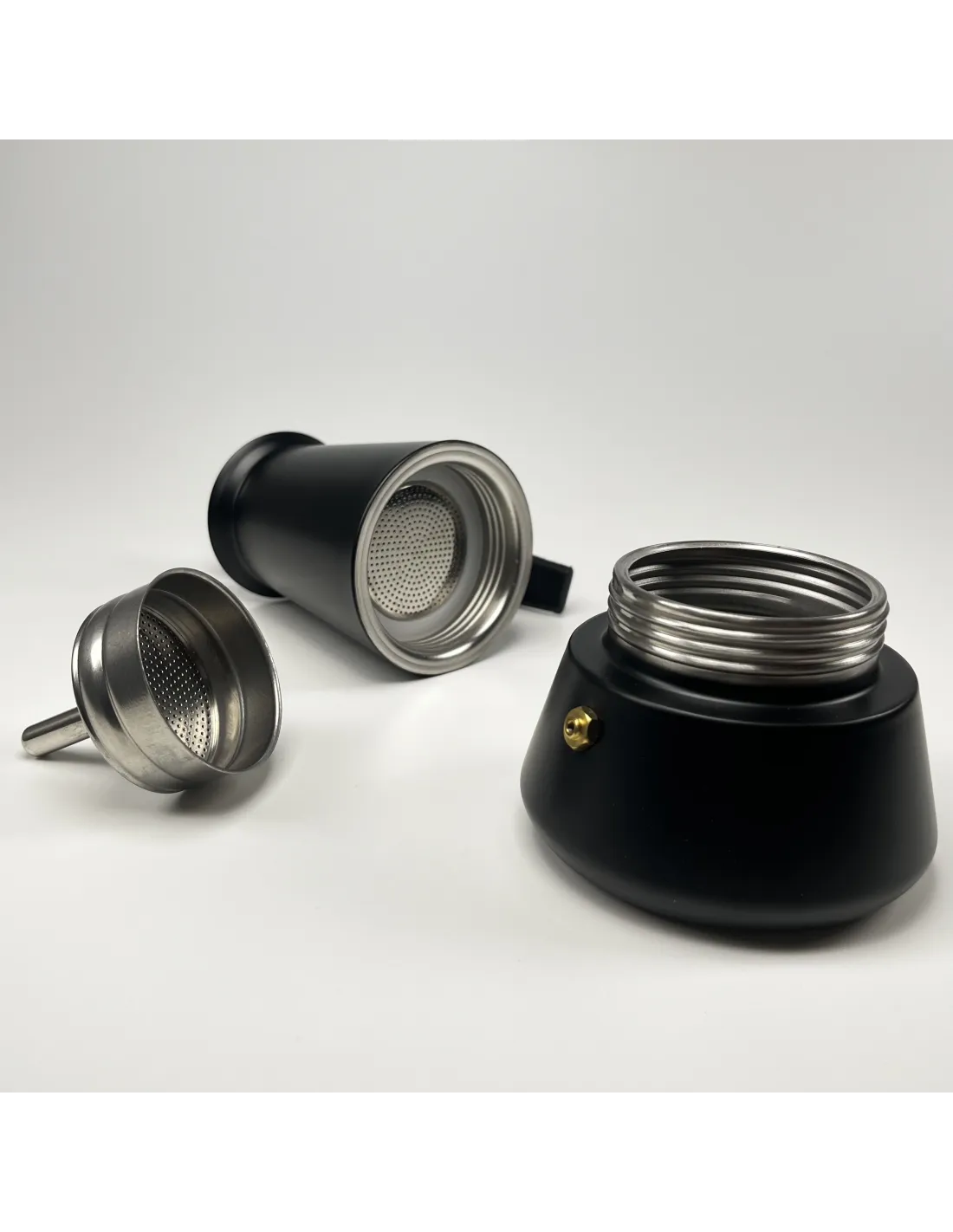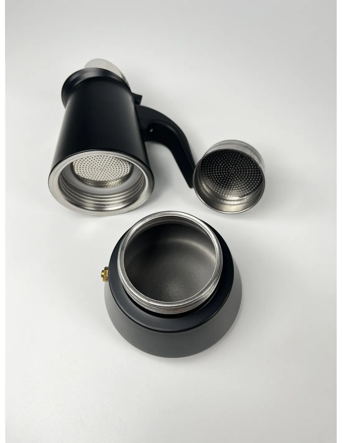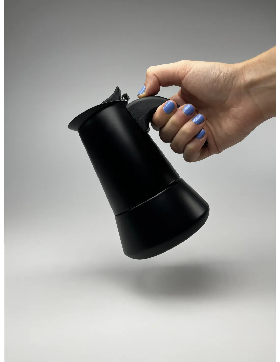 Crni mocha kuhalo od nehrđajućeg čelika Kaffia za pripremu 4 šalice mocca kave. Jednostavan način pripreme vrlo sličan espressu, ali uz djelić cijene. Zapremina: cca 201,5 ml. Prikladno i za indukcijske ploče.