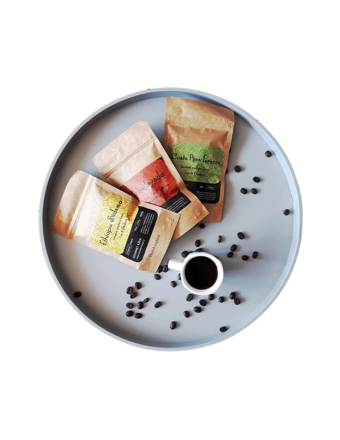 Za vas imamo ove uzorke naše 100% Arabica kave , jednu mješavinu espressa i jednu robustu, tj. Brazil Santos , Colombia Supremo , Costa Rica Tarazzu , Ethiopia Sidamo , Cuba Lavado , Brazil Santos Medium Roast , Kenya Top Masai i Ethiopia Sidamo Medium Roast Brazil Fazenda Rainforest , Guatemala Trés Maria i Pura Vida Espresso Blend , Kenya Top Masai Medium Roast , Costa Rica Tarazu Medium Roast i India Robusta Trešnja.