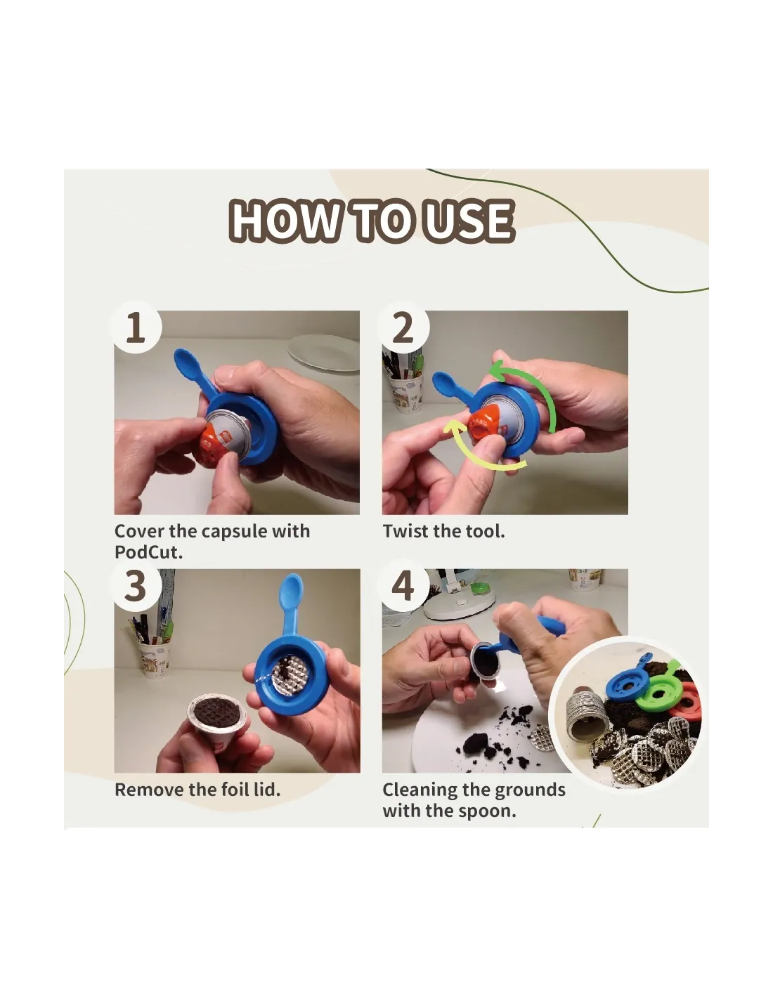 Otvarač za kapsule PodCut™ ® je alat za recikliranje Nespresso ® kapsula za kavu koji ne bi trebao nedostajati ni u jednom kutku za kavu s aparatom za kavu s kapsulama. Ovaj inovativni alat idealan je za ljubitelje kave koje zanima i ekologija . Omogućuje jednostavno recikliranje aluminijskih kapsula i njihovog sadržaja. Pravilnim recikliranjem kapsula pridonosite zaštiti okoliša , a istovremeno talog kave možete ponovno upotrijebiti kao gnojivo za cvijeće ili izravno na kompost te eliminirati pojavu neugodnih mušica koje se često pojavljuju oko košara s iskorištenim kapsulama.