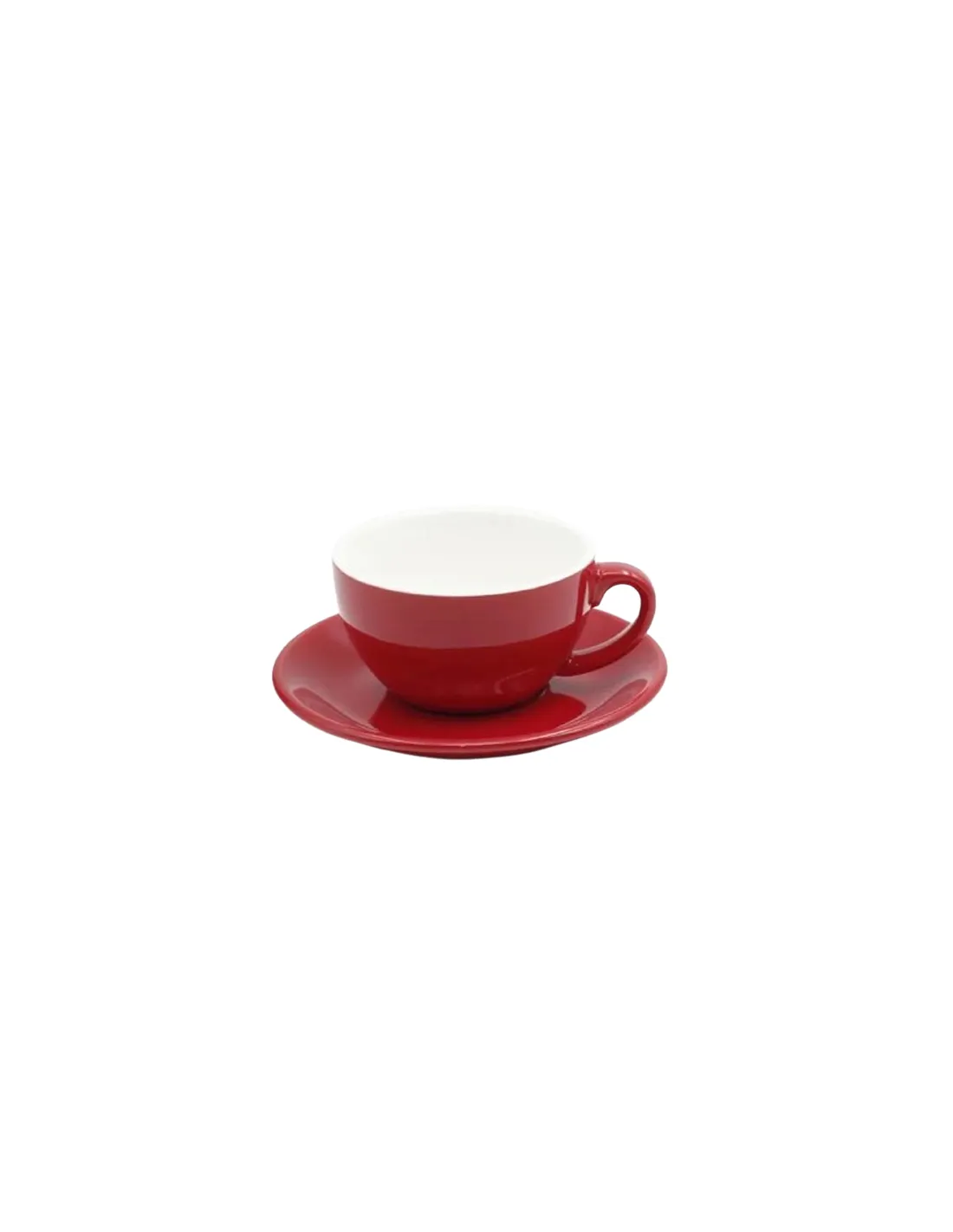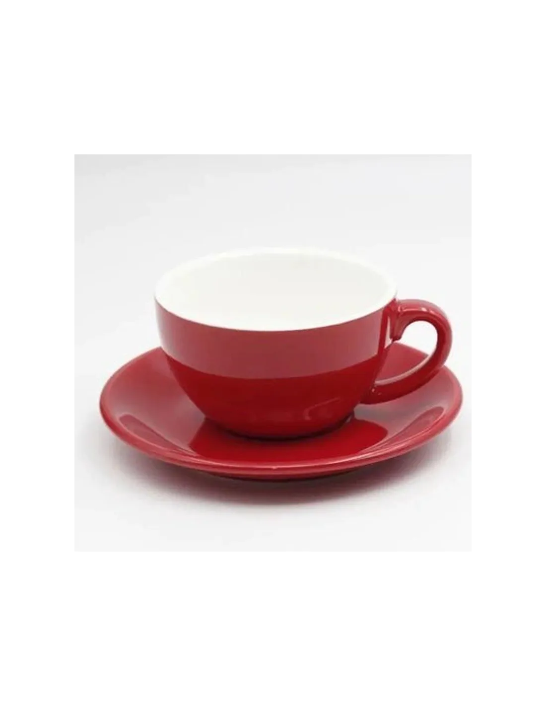 Porculanska šalica za cappuccino zapremine 200 ml. Uključuje i tanjurić . Boja: crvena .