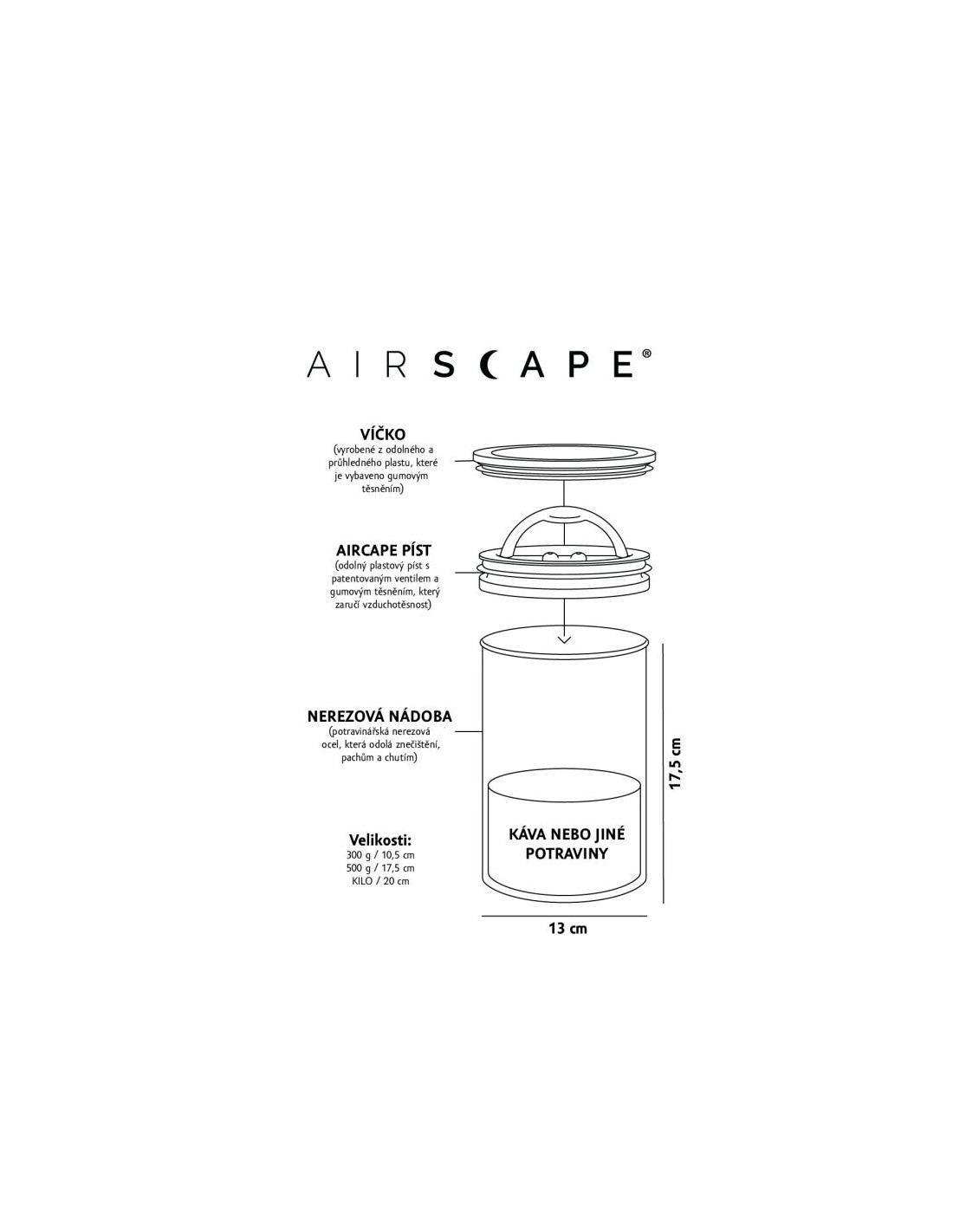 Čelična posuda AirScape nije prikladna samo za kavu , već i za čaj, brašno, orašaste plodove, šećer, sol ili drugu rastresitu hranu . Preporučuje se ručno pranje kako bi se održao njezin dugi vijek trajanja i nepropusnost sustava.