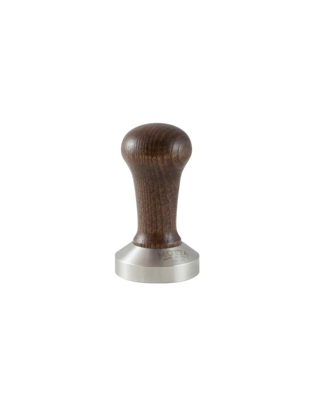 Profesionalni tamper Motta ima metalnu bazu i ergonomsku drvenu ručku, a težina mu je 350g.