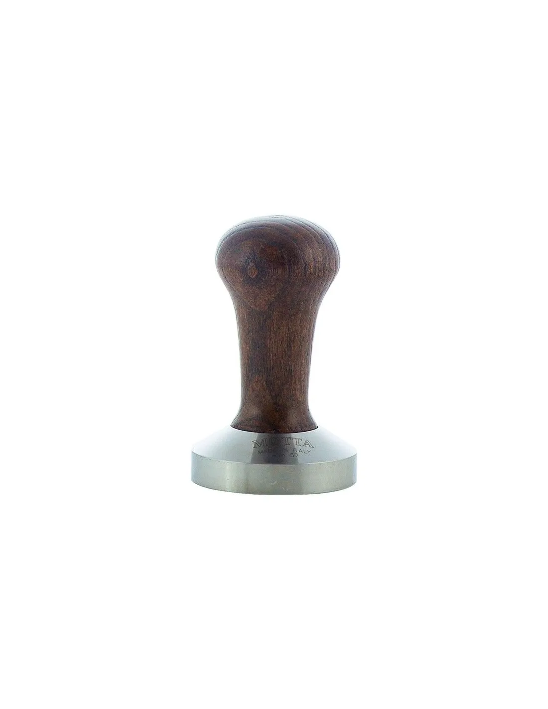 Profesionalni Motta tamper ima metalnu bazu i ergonomsku drvenu ručku, a težina mu je 350g.
