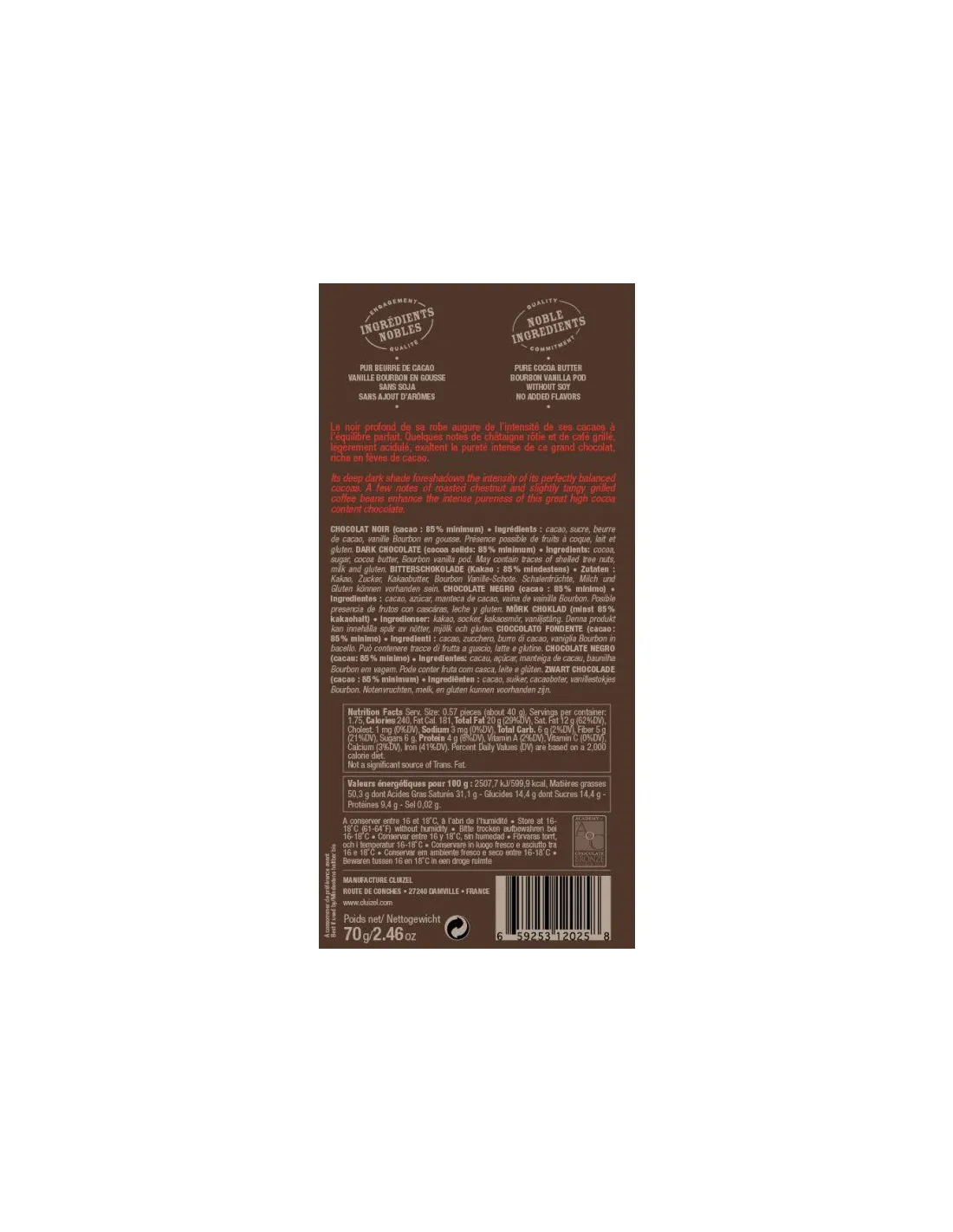 85% čokoláda připravená z pečlivě vybrané kombinace různých druhů kakaa z centrální Ameriky, Afriky a Jávy. Intenzivní a přitom jemná čokoláda, příjemně chuťově vyvážená.