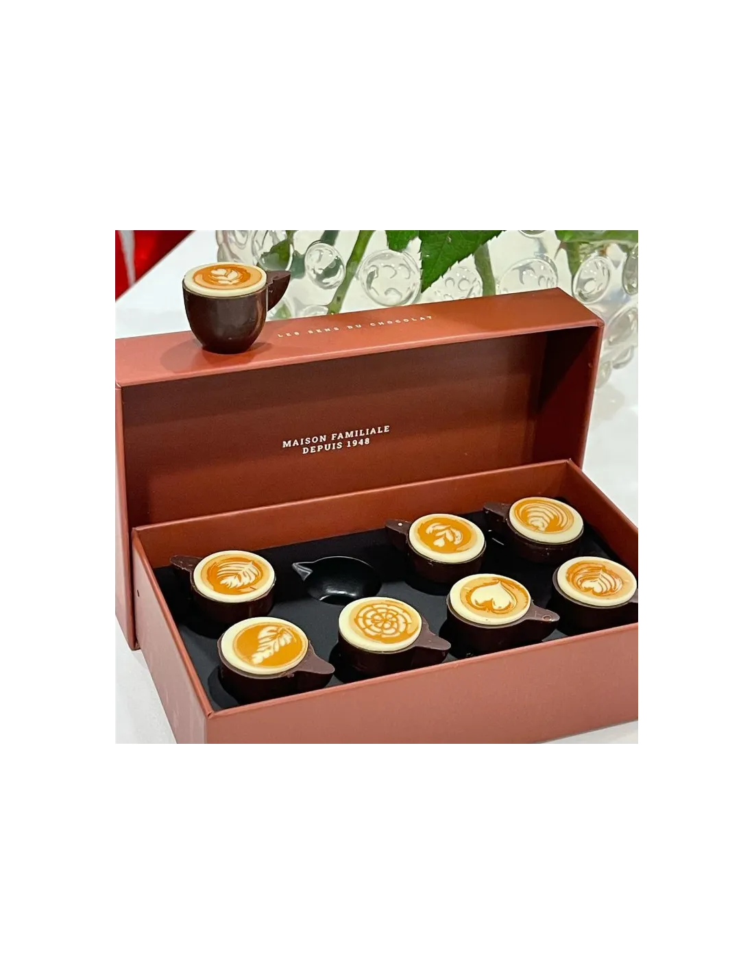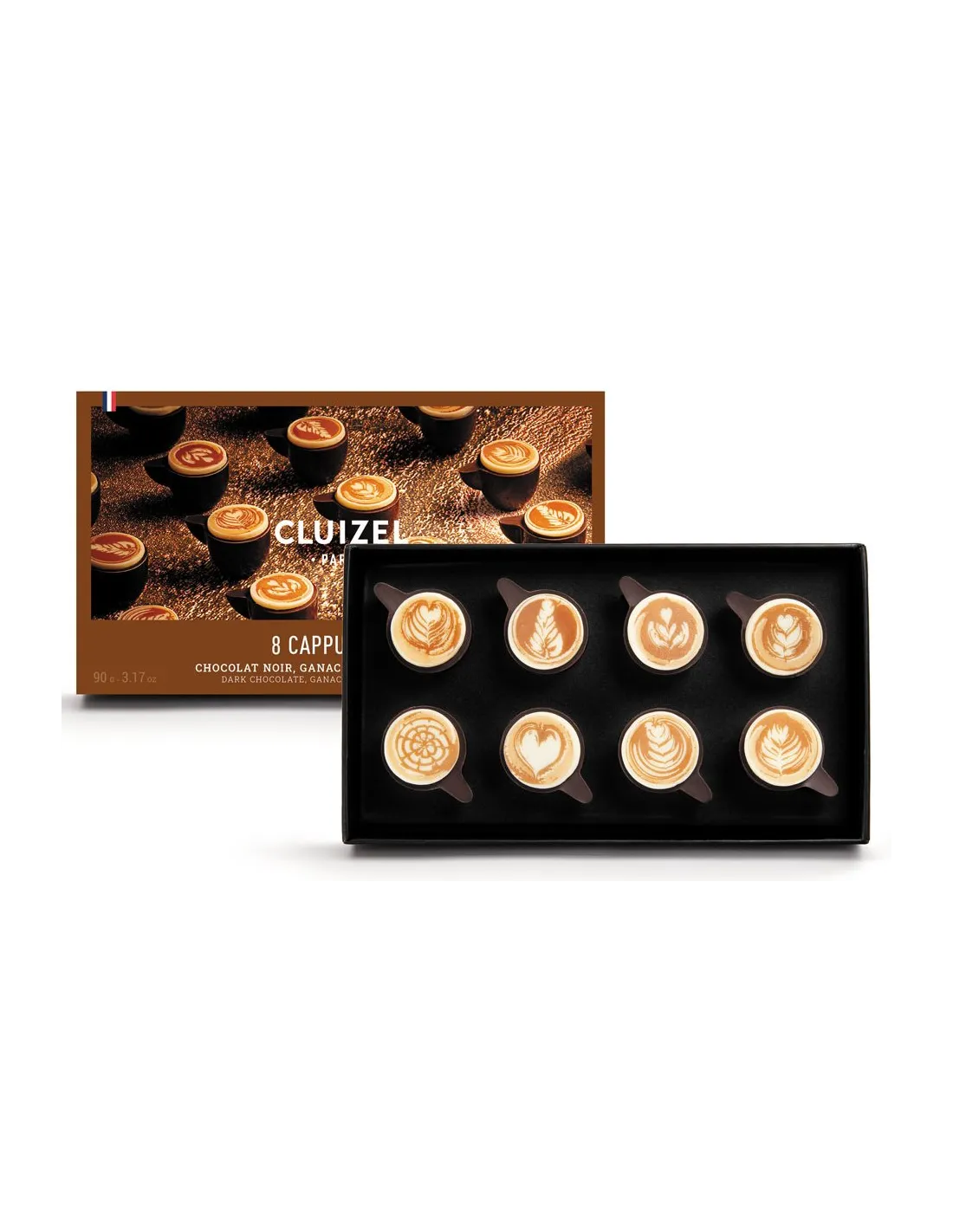 8 maštovitih pralina u obliku malih Cappuccina čašica od crne gurmanske čokolade punjene su ganacheom od meke kave (krem kremom) i ukrašene bijelom čokoladom. Majstorski novitet Michela Cluizela!