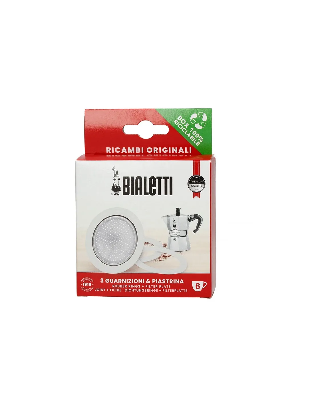 Pakiranje sadrži 3x rezervne gumene brtve za Bialetti aluminijske mocha lonce u veličini od 6 šalica i ujedno 1x rezervno aluminijsko cjedilo .
