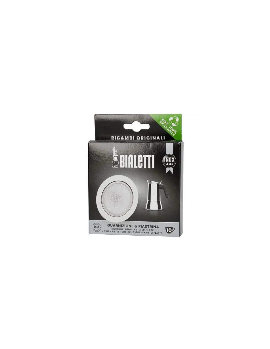 Paket sadrži 1x rezervnu silikonsku brtvu za Bialetti inox mocha lonce u veličini od 10 šalica i istovremeno 1x rezervnu inox cjediljku.