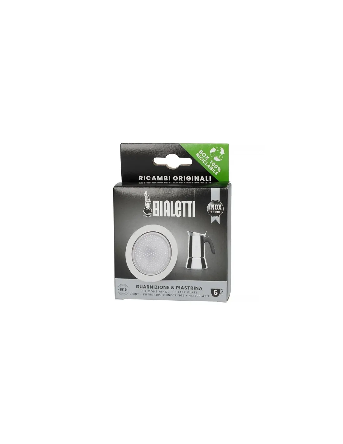 Pakiranje sadrži 1x rezervni silikonski zatvarač za Bialetti inox mocha lonce u veličini od 6 šalica i istovremeno 1x rezervno inox cjedilo .